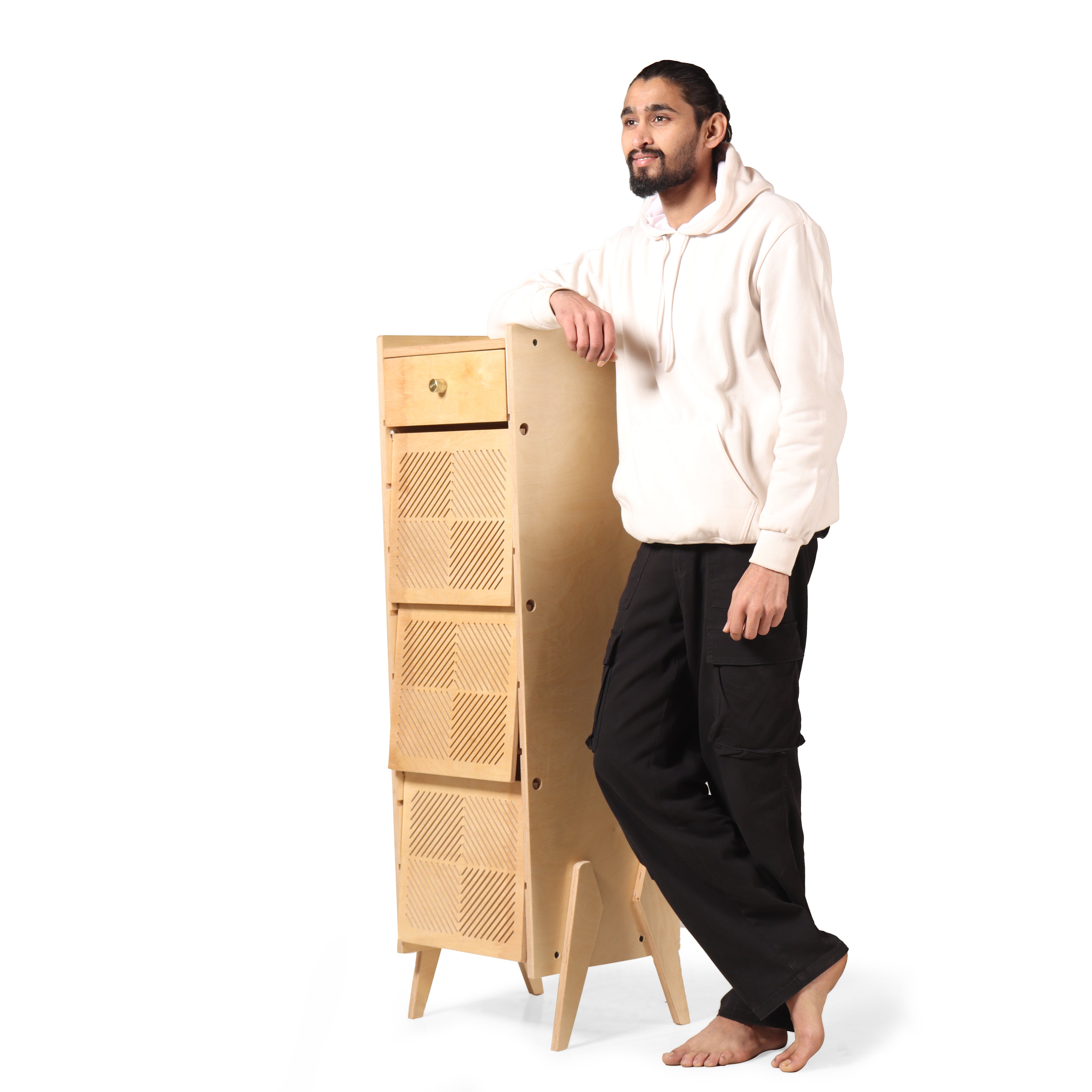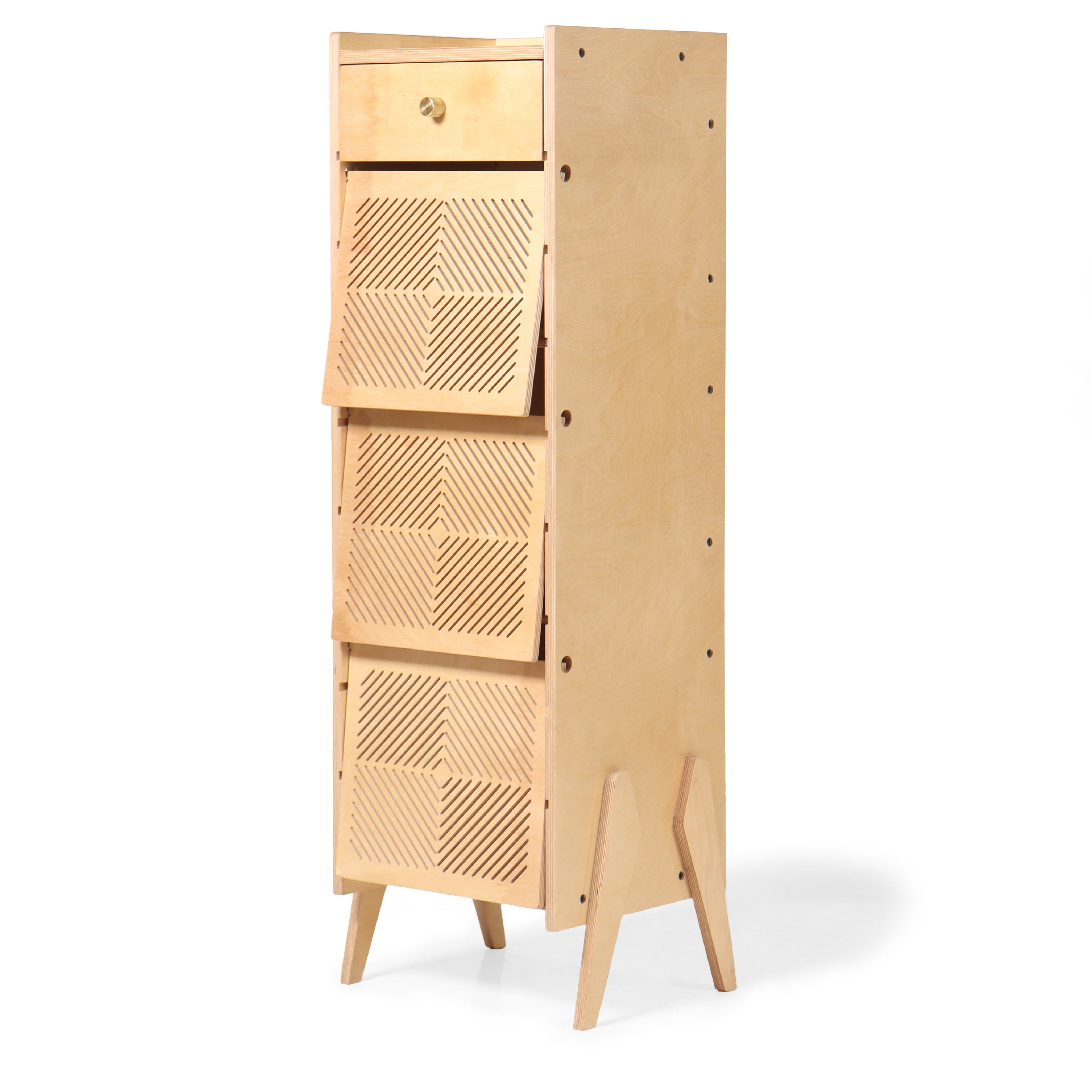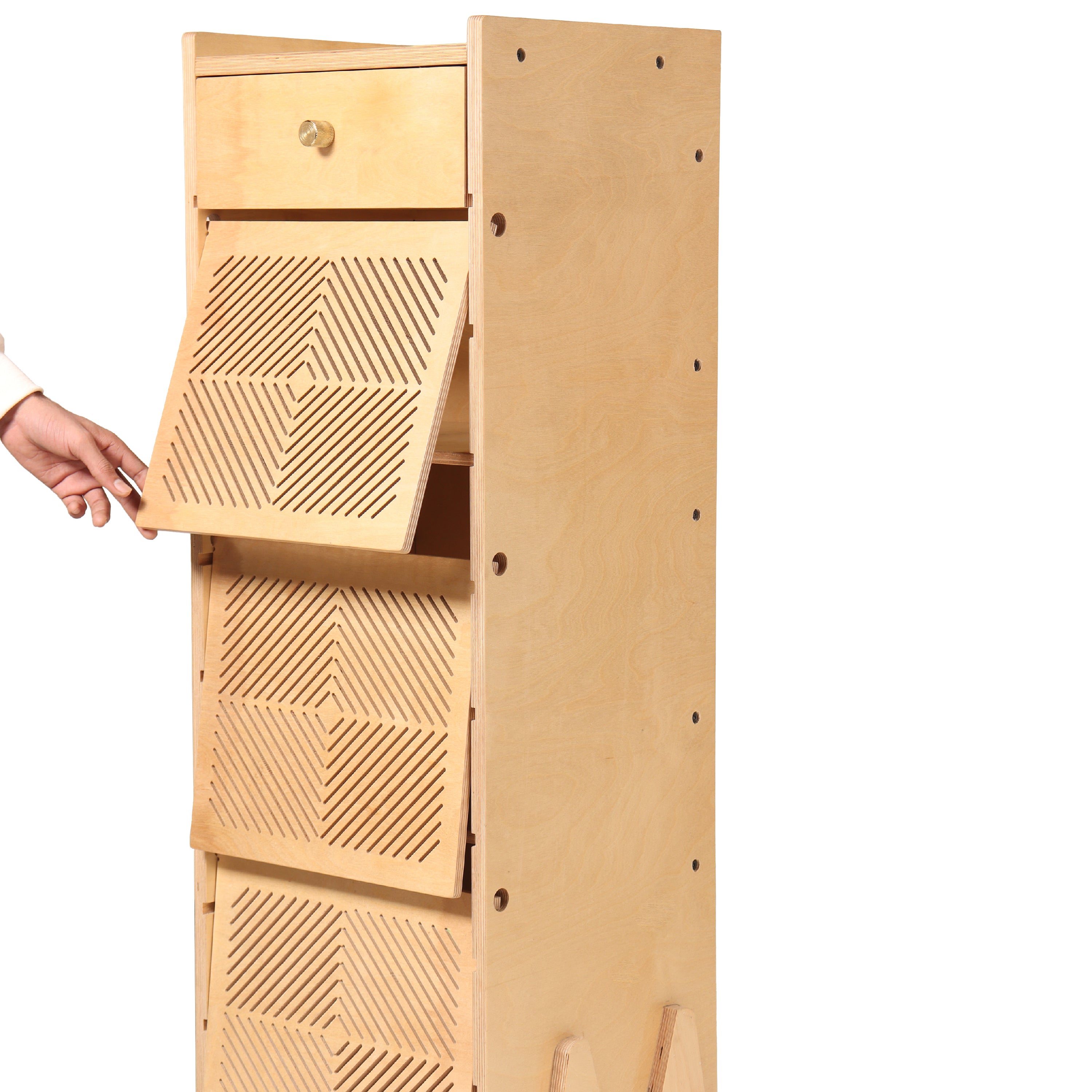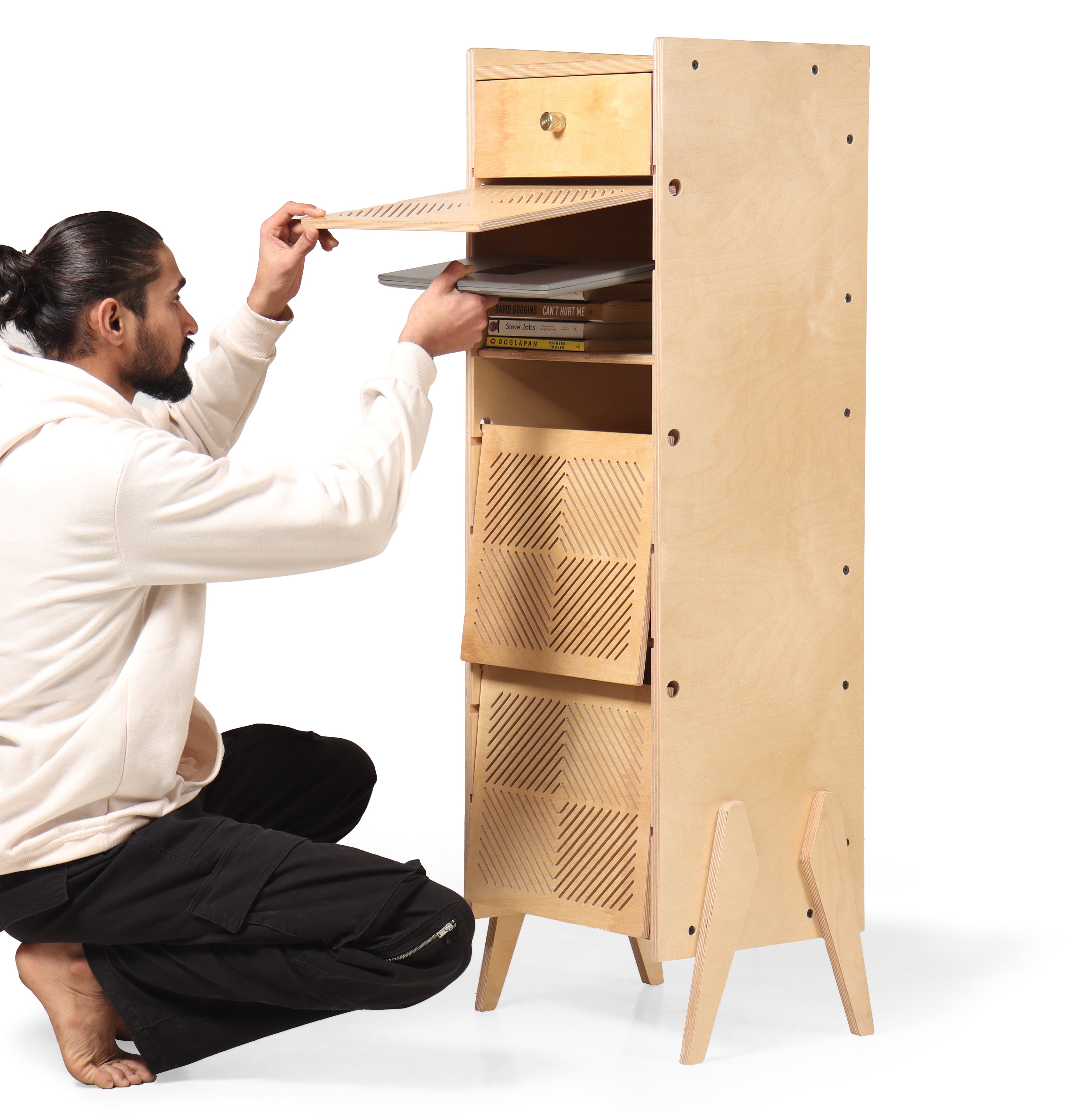 Introducing the ENE Storage, a revolution in customizable organization. Inspired by the need to store a variety of items in different shapes and sizes, the ENE features modular storage cells. These cells can be stacked vertically to adjust the unit's height, perfectly accommodating your belongings without compromising on aesthetics. Maintain a clutter-free living space with the ENE's hidden storage. Integrated shutters conceal the contents while allowing for breathability, preventing musty odors. For smaller valuables, the ENE incorporates a discreet drawer, offering a lockable storage solution. Standing at an optimal height of 5 feet, the ENE seamlessly integrates into any corner of your living room or dining room, providing exceptional functionality with a modern and stylish design.