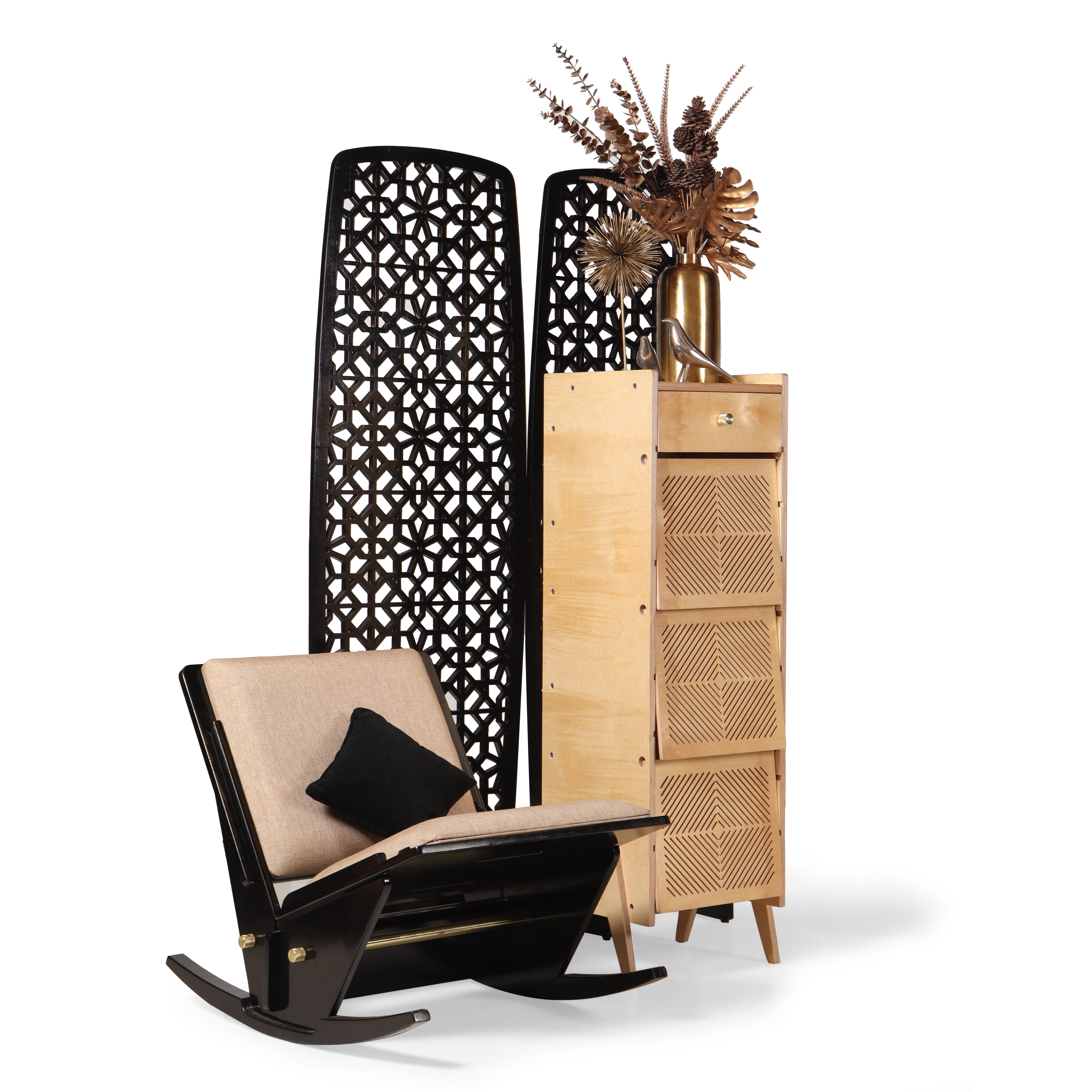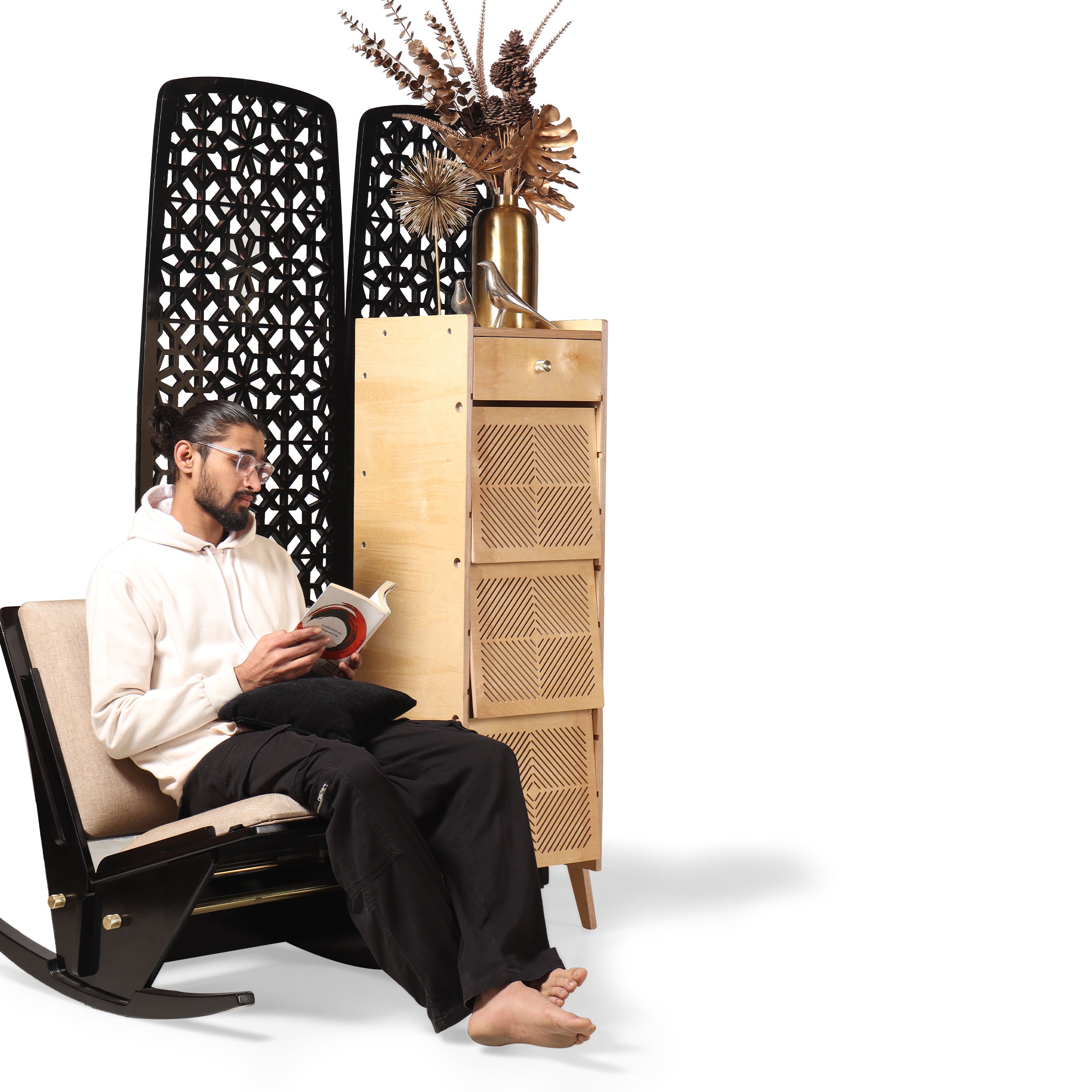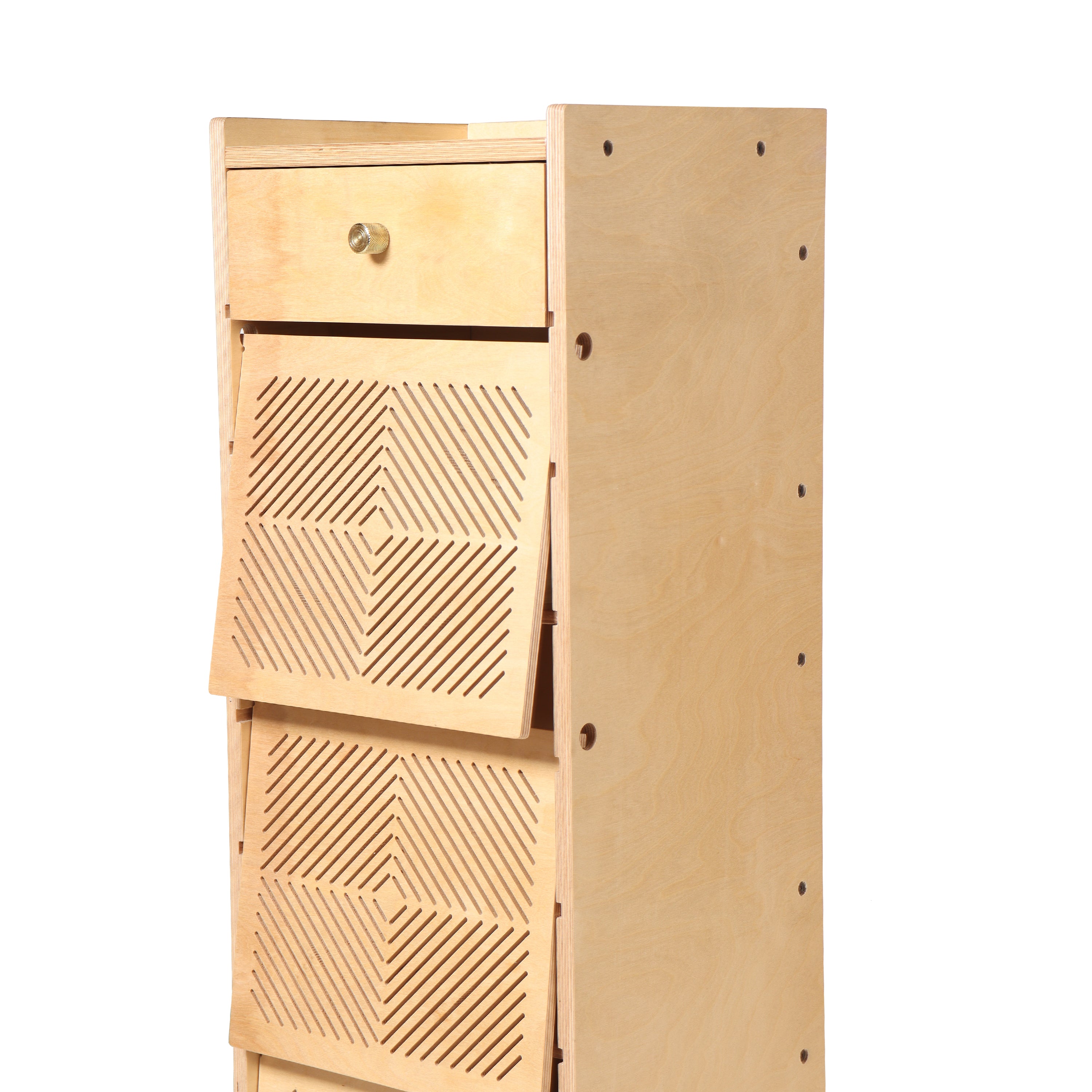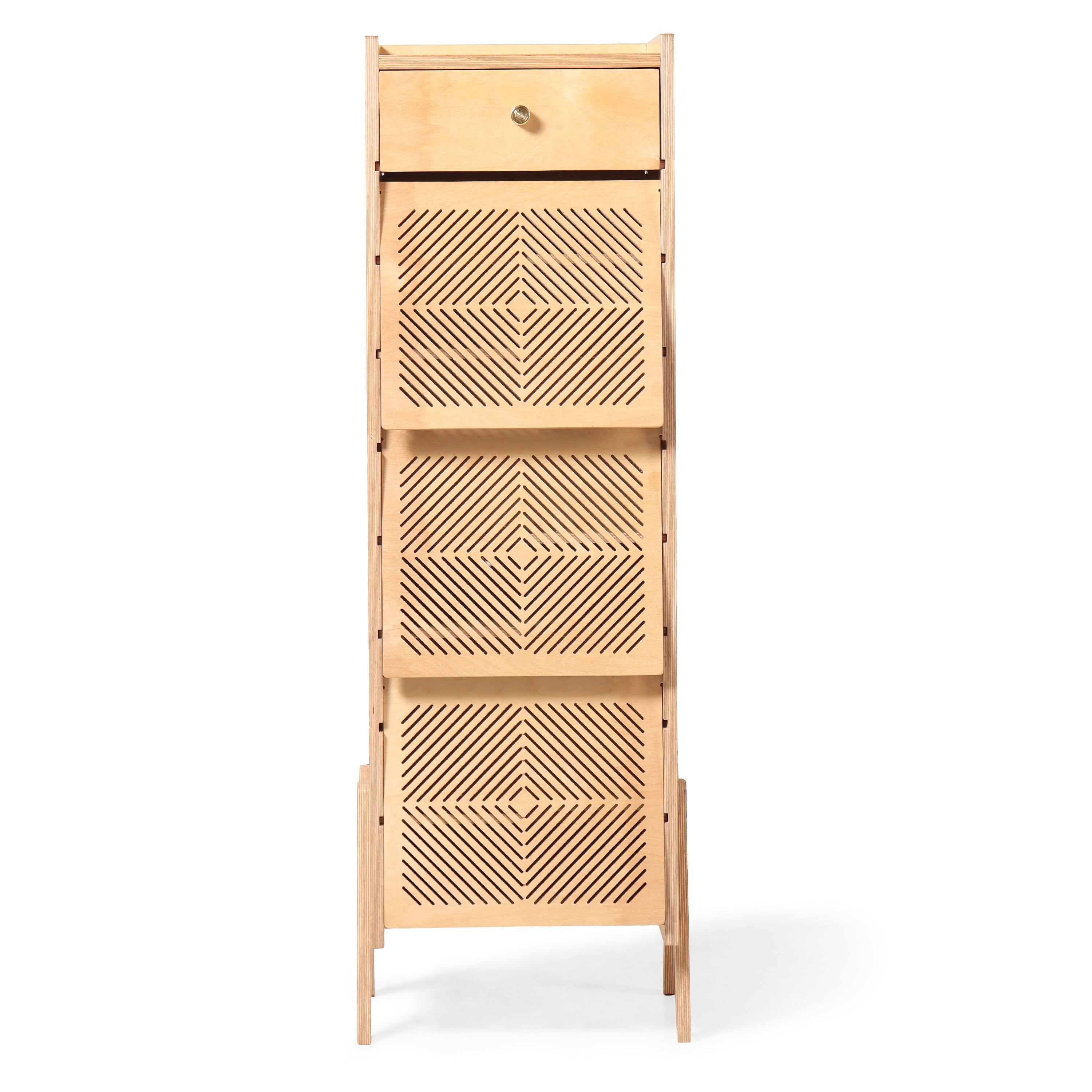 Introducing the ENE Storage, a revolution in customizable organization. Inspired by the need to store a variety of items in different shapes and sizes, the ENE features modular storage cells. These cells can be stacked vertically to adjust the unit's height, perfectly accommodating your belongings without compromising on aesthetics. Maintain a clutter-free living space with the ENE's hidden storage. Integrated shutters conceal the contents while allowing for breathability, preventing musty odors. For smaller valuables, the ENE incorporates a discreet drawer, offering a lockable storage solution. Standing at an optimal height of 5 feet, the ENE seamlessly integrates into any corner of your living room or dining room, providing exceptional functionality with a modern and stylish design.