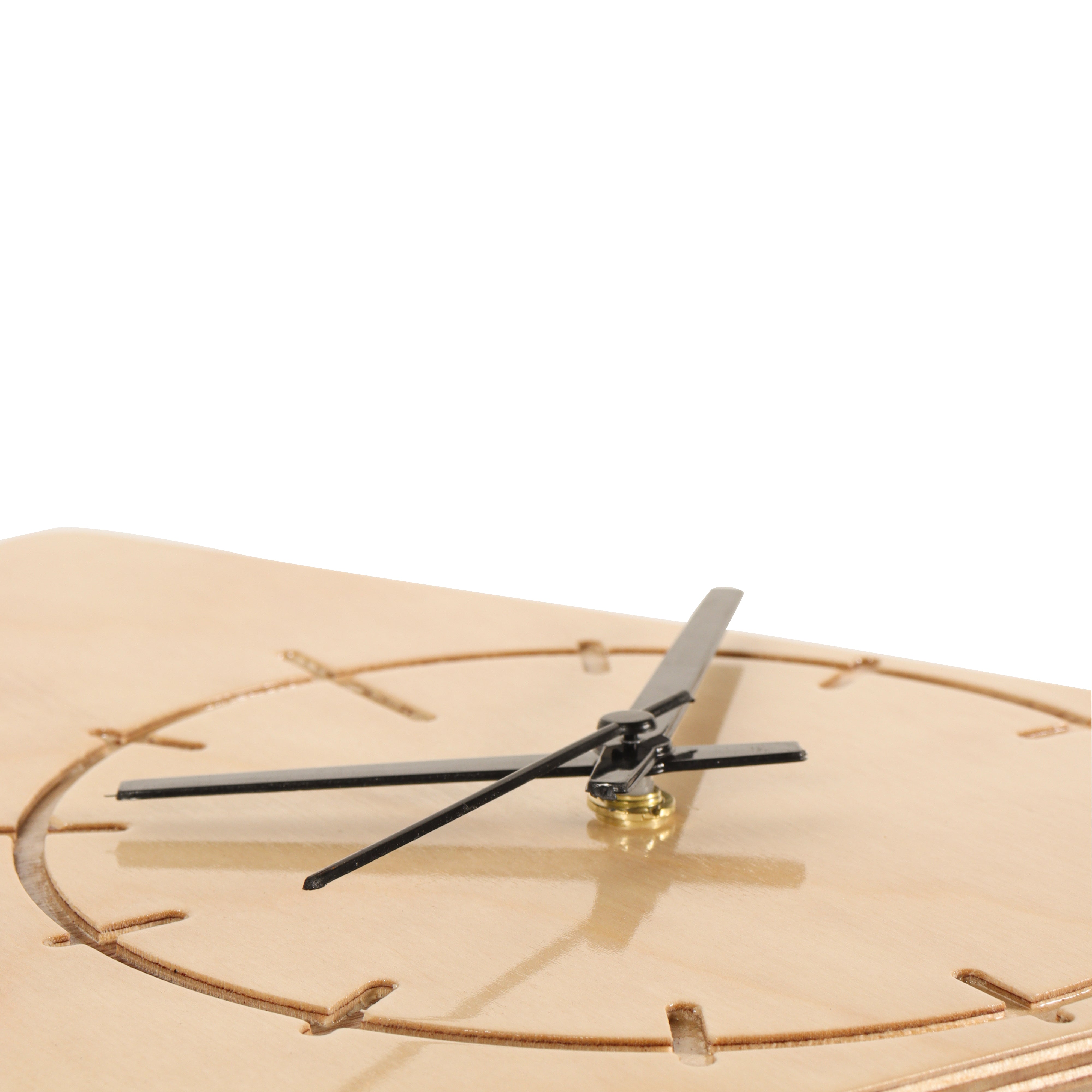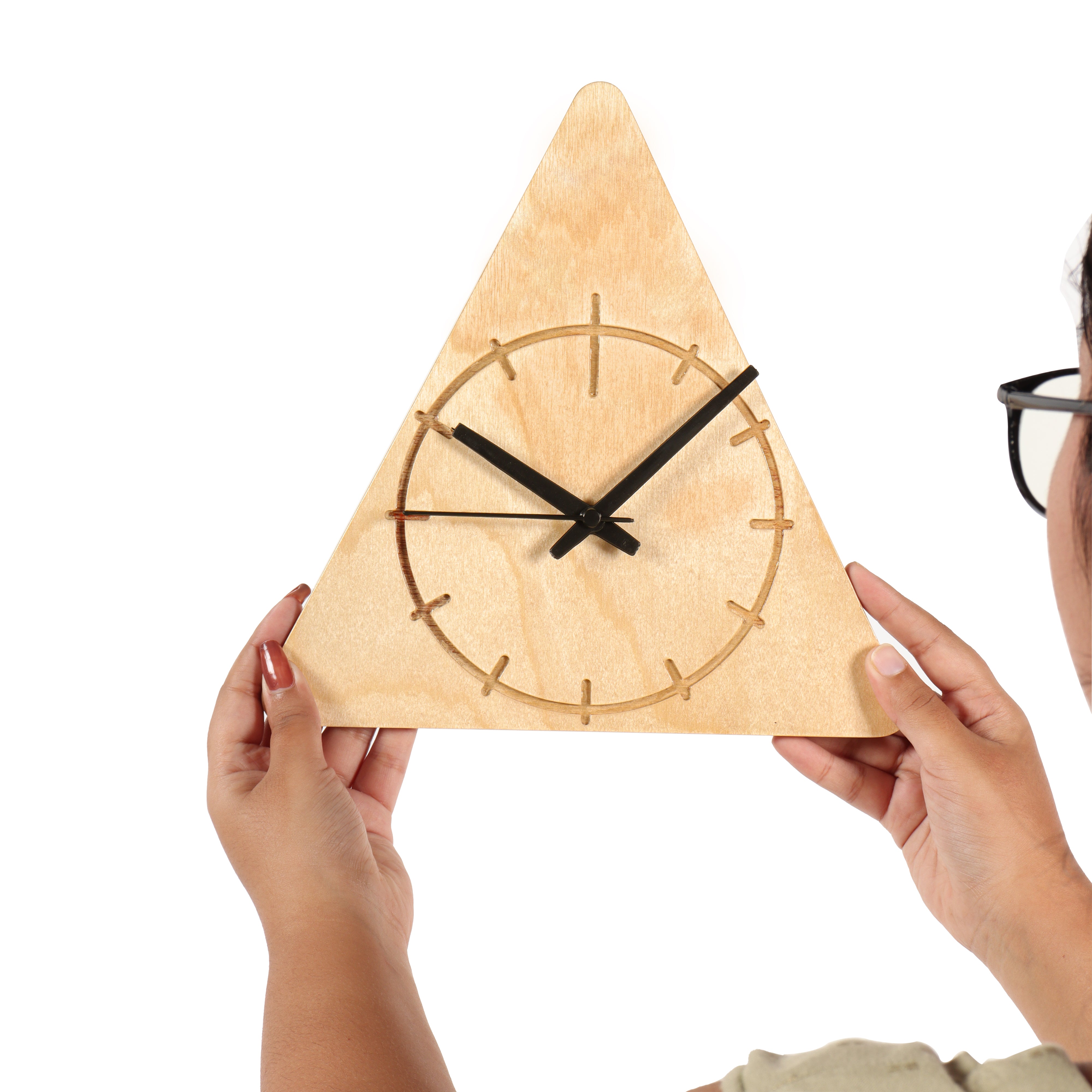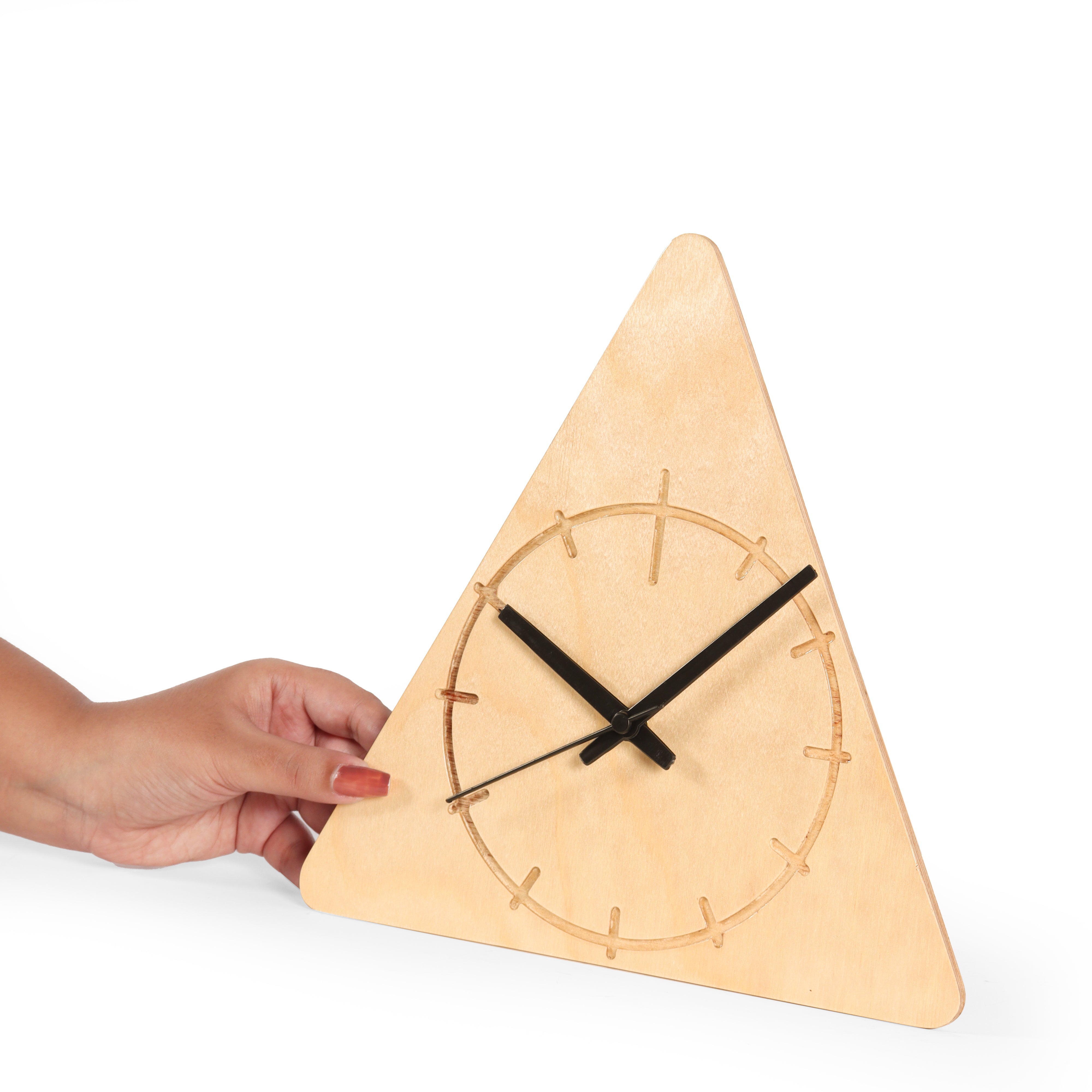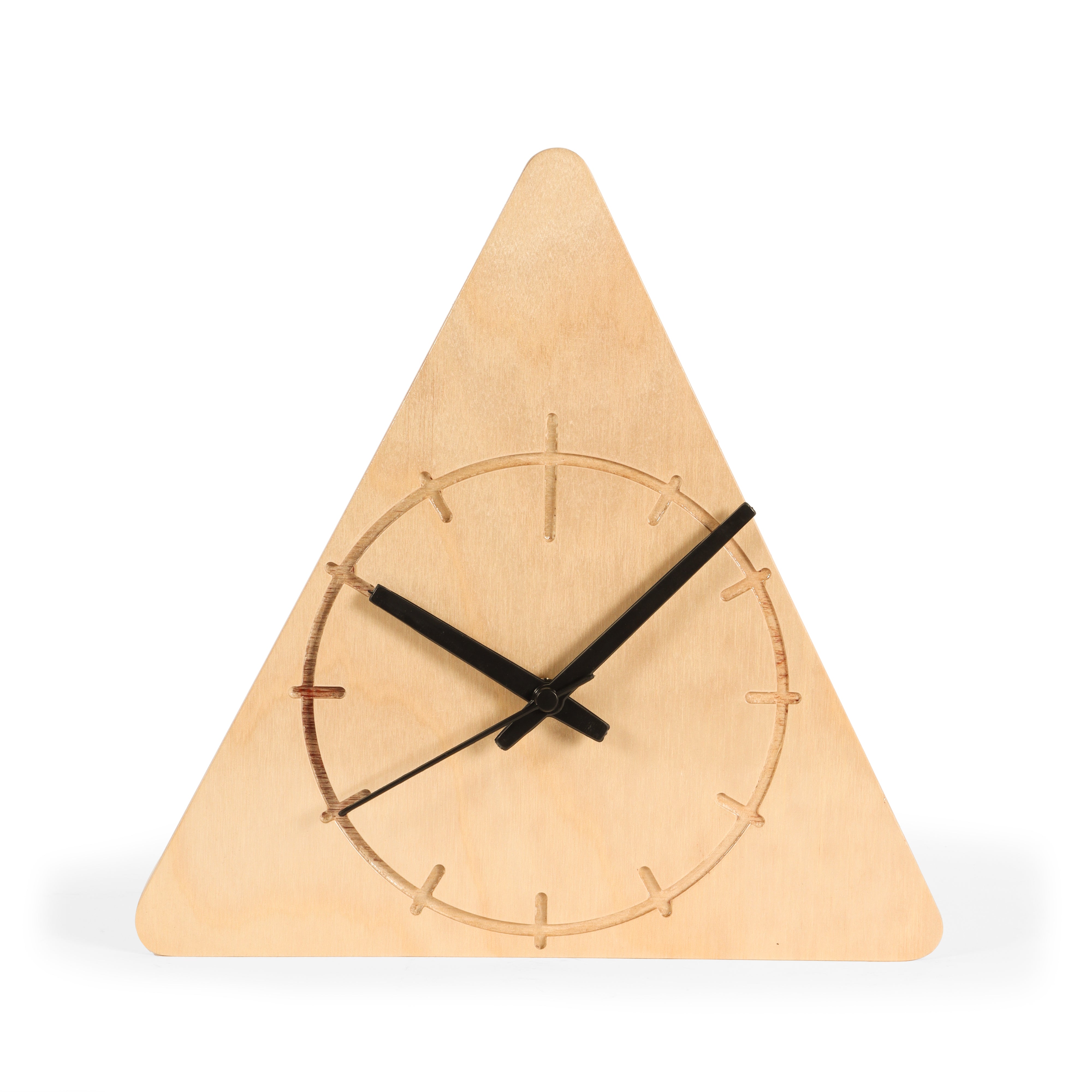 This minimalist triangular wall clock is crafted from light-colored birchwood. It features a simple etched clock face with thin black hands, blending natural materials with modern geometric design for a stylish timekeeping accent.