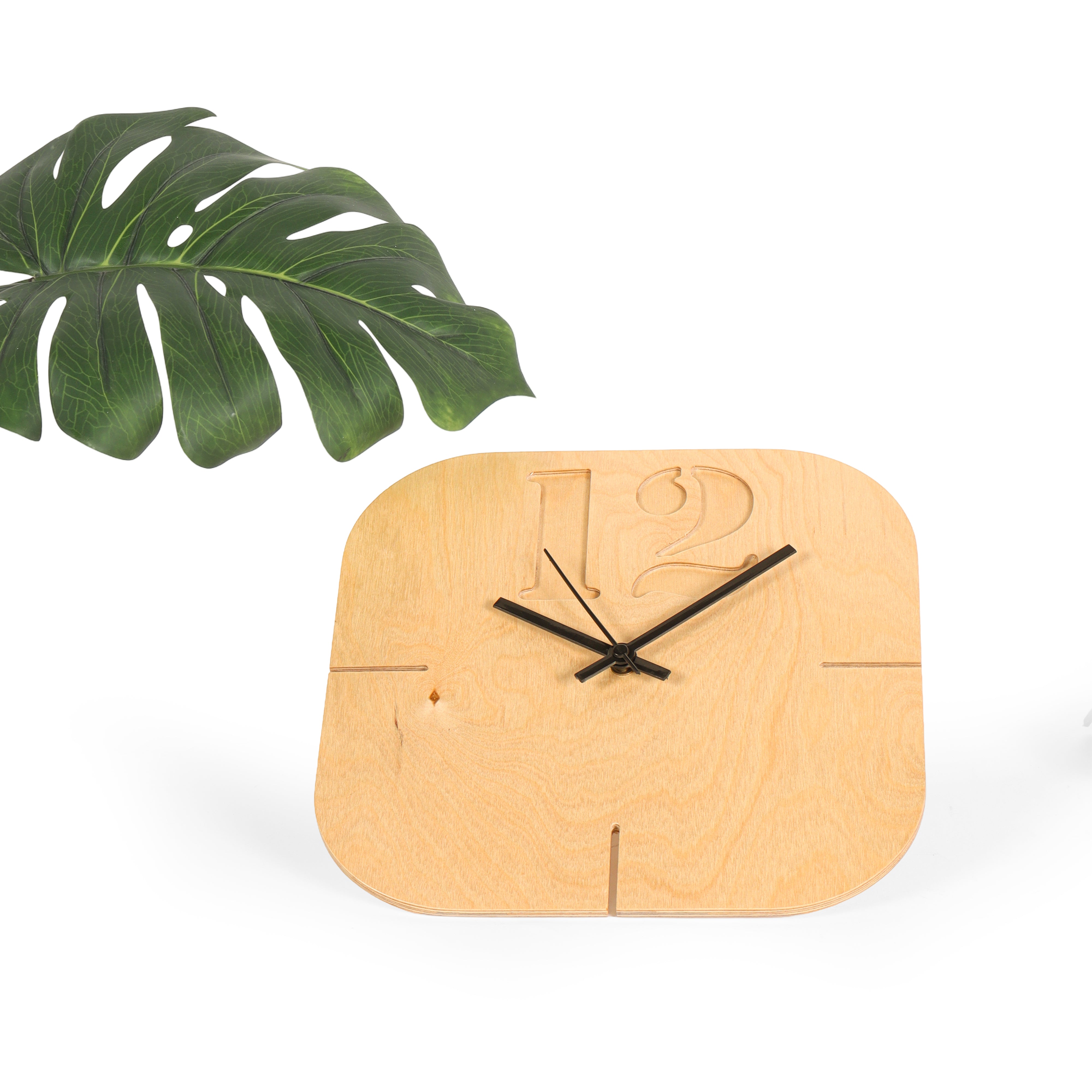 This modern wall clock features a simple, rectangular design crafted from birchwood. The large, engraved number “12” adds a unique touch. Its clean lines and natural finish make it a versatile piece for any contemporary space.