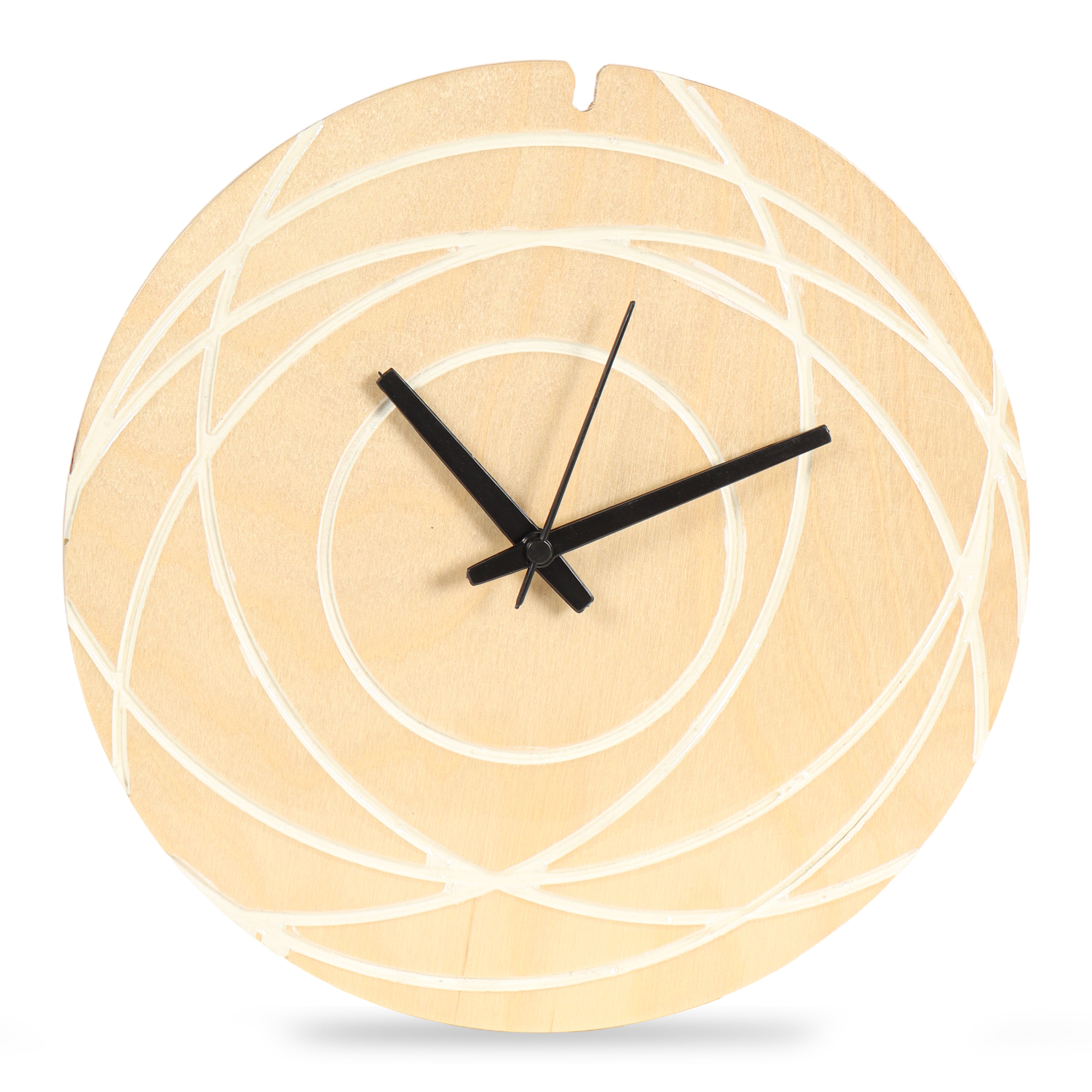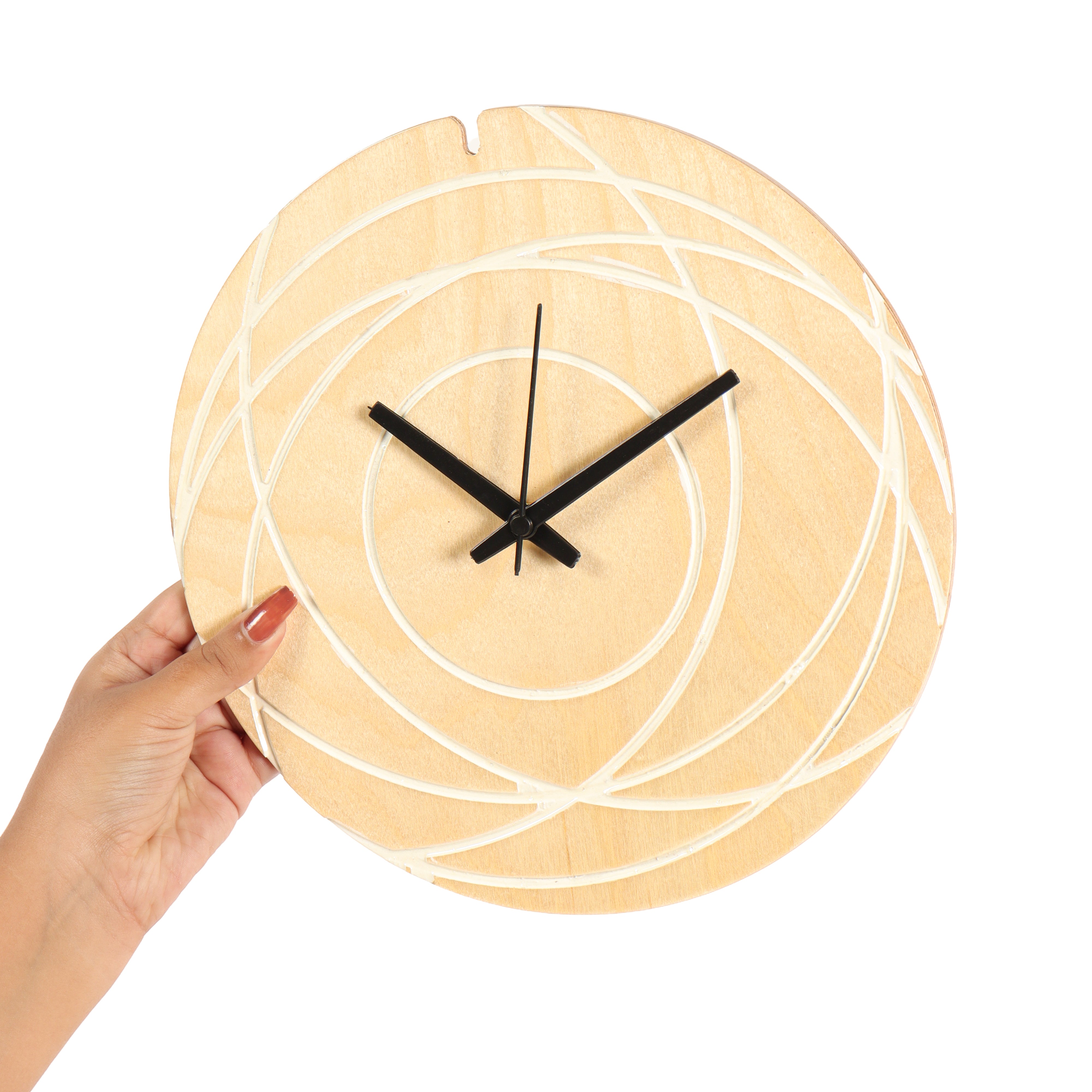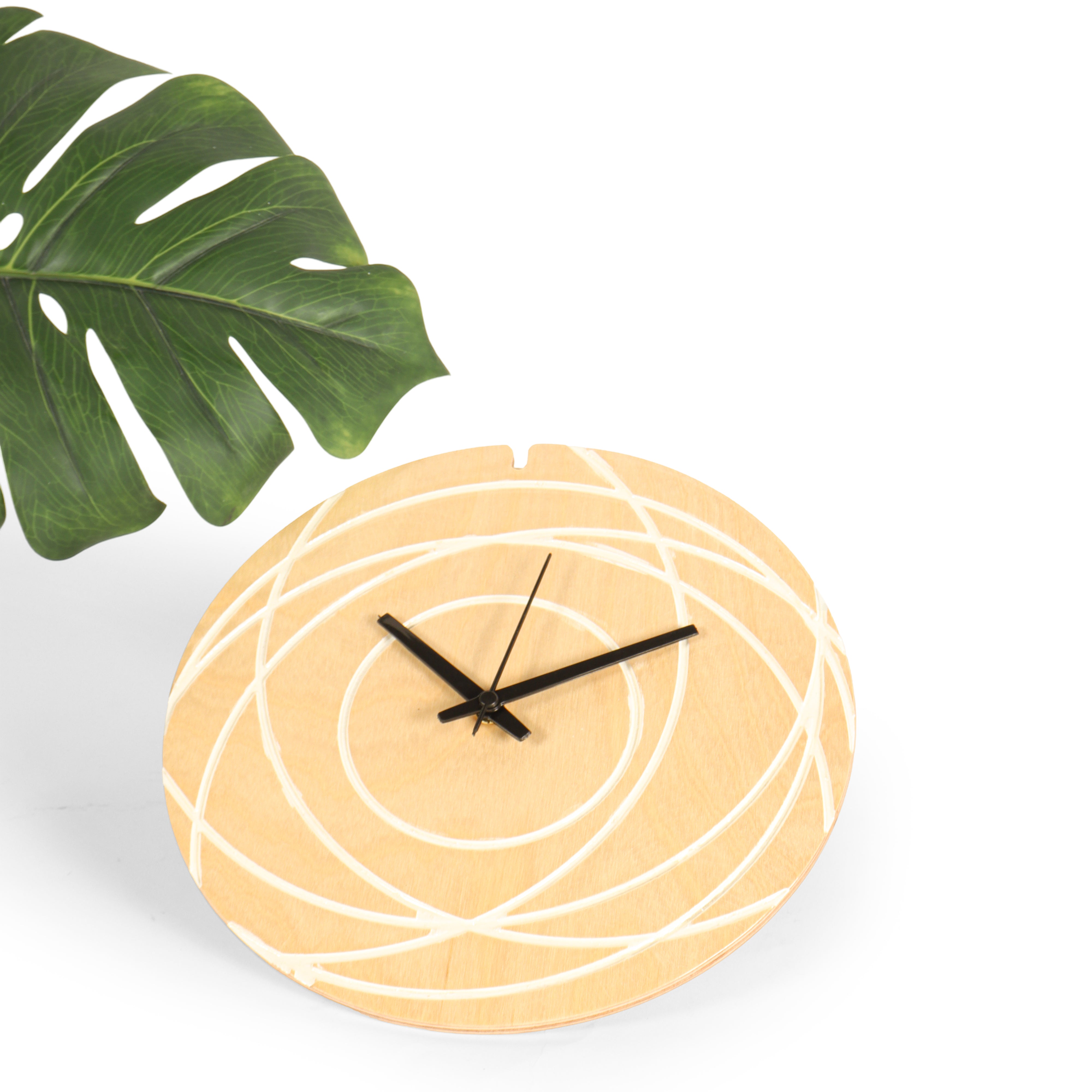This circular wall clock, crafted from birchwood, features intricate white lines that create a mesmerizing design. Its minimalist aesthetic and natural wood finish make it a unique and eye-catching piece.