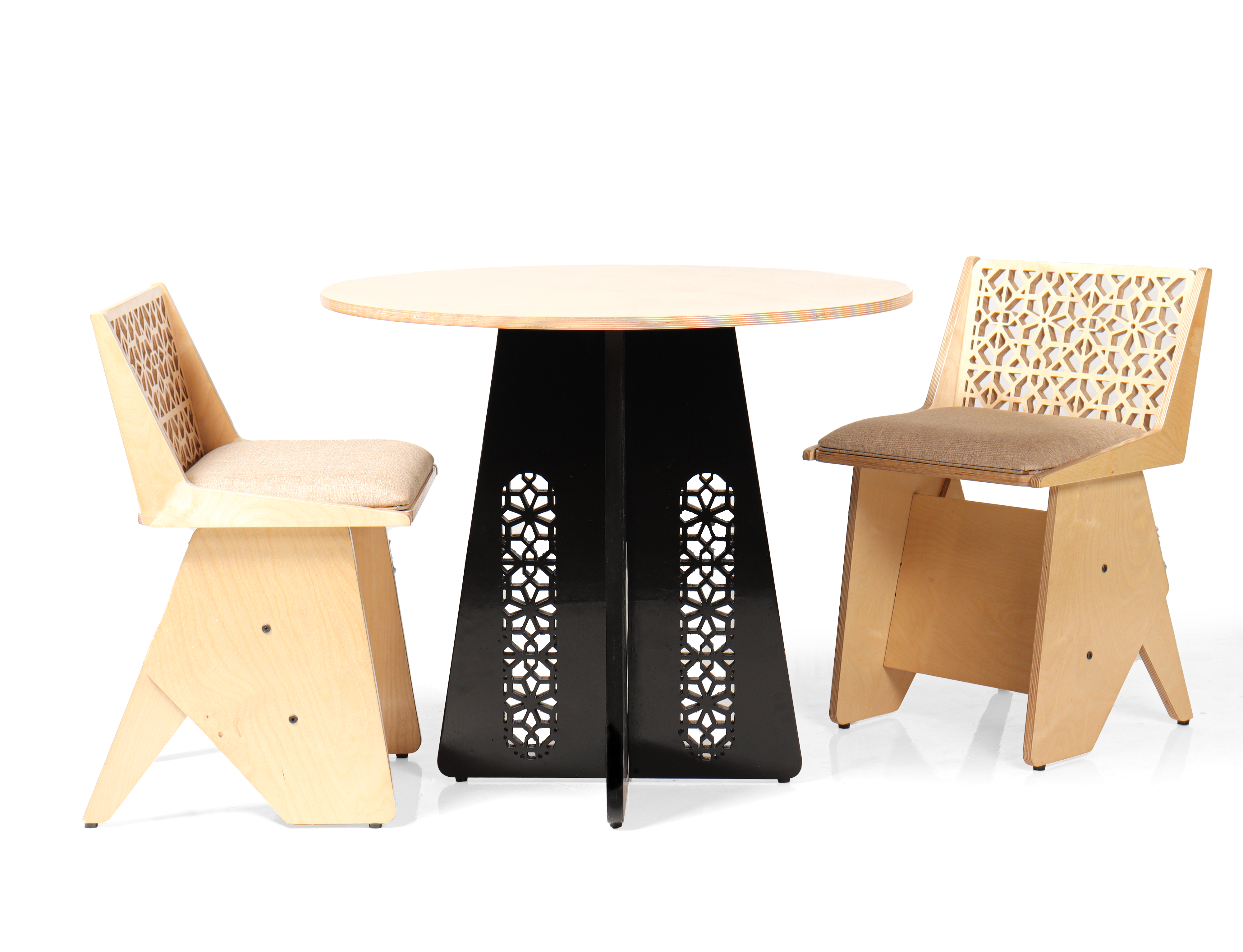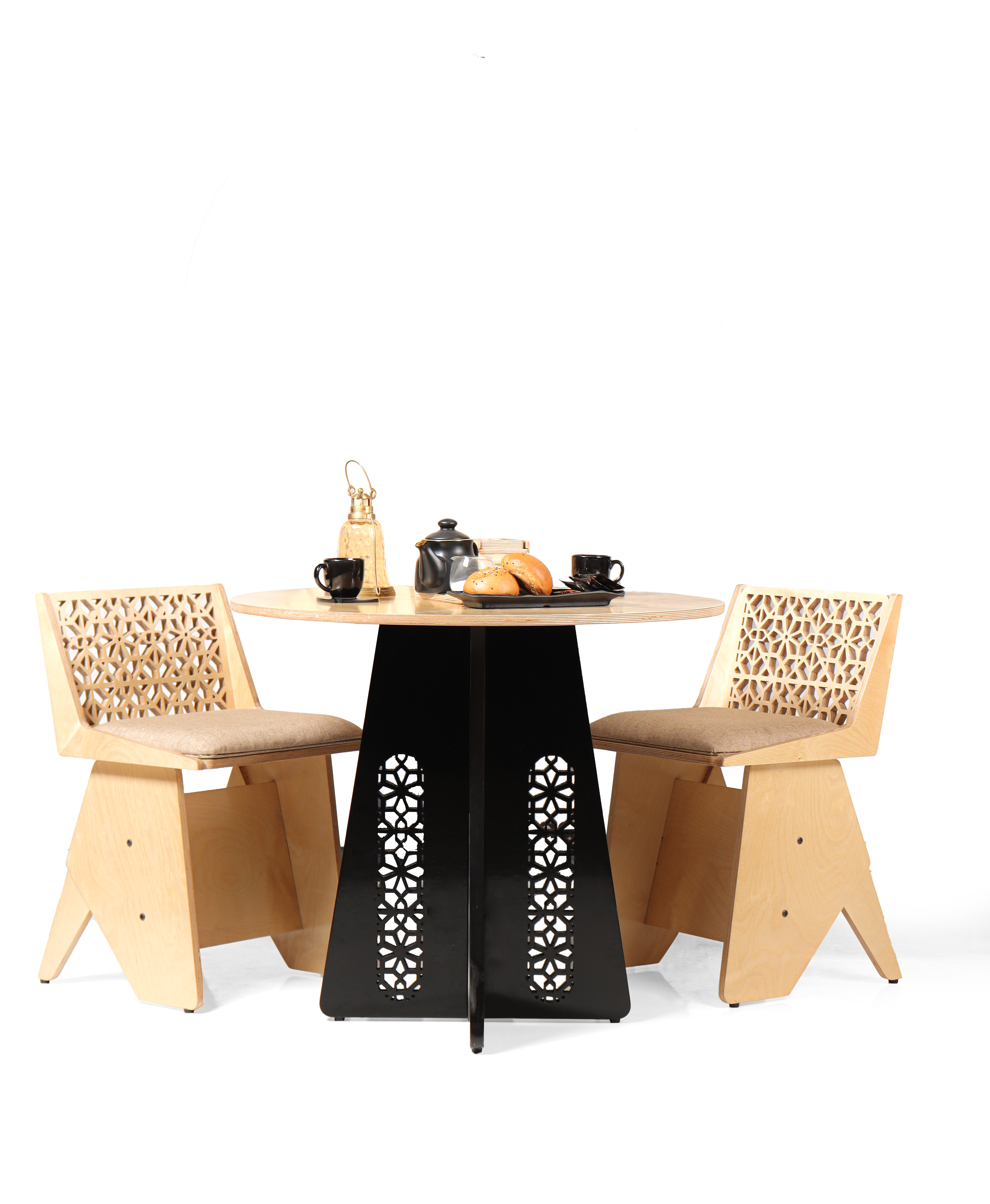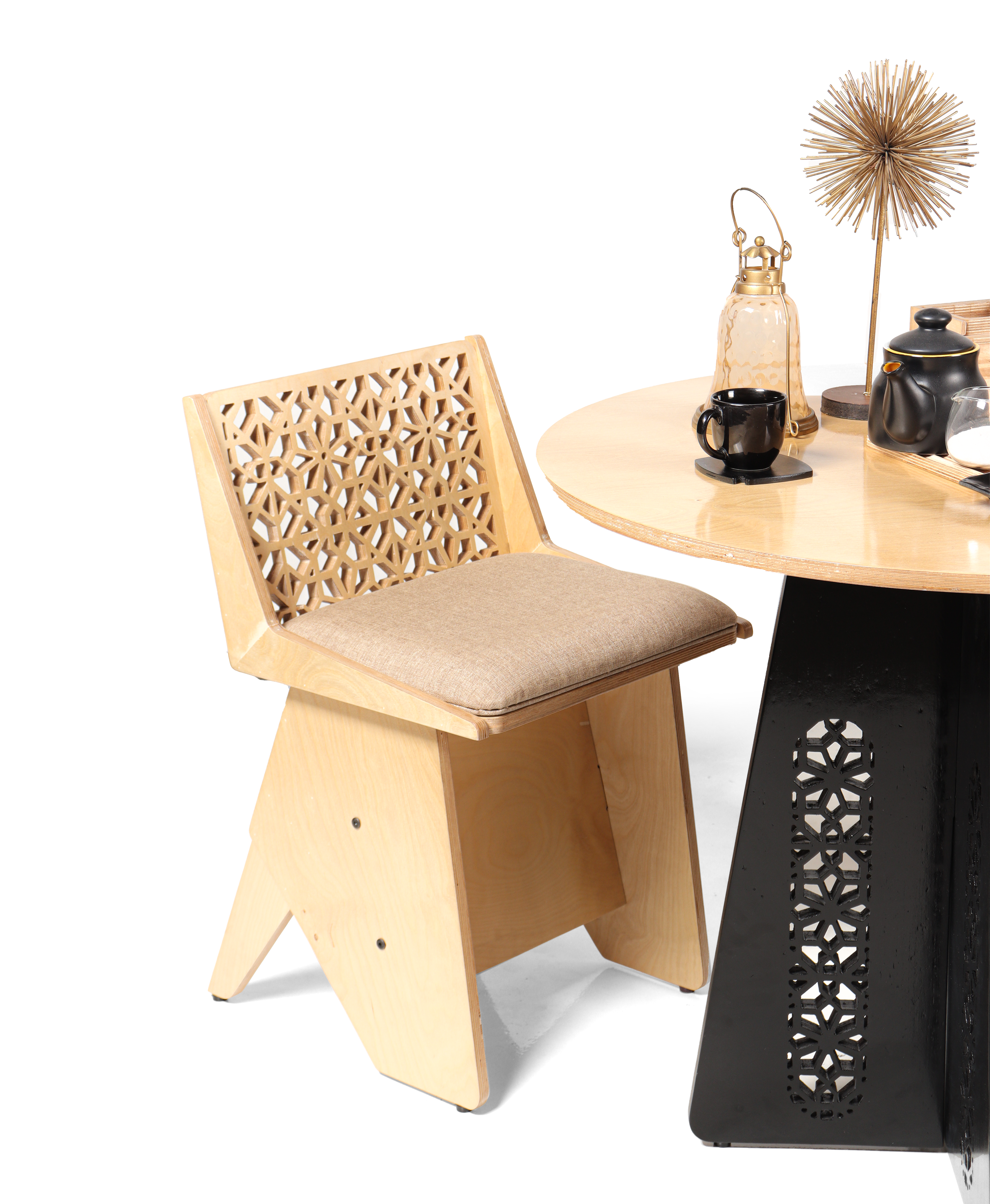 "Maari" – a four-seater table with a 3ft diameter Russian Birchwood top and sleek "Maaru" chairs. This stylish set combines Indian jaali architecture with Scandinavian flat pack design for a unique aesthetic. Compact and ergonomic, "Maari" is perfect for urban living, offering a chic and pocket-friendly alternative to bulky dining sets. Elevate your space with this blend of cultural charm and modern convenience.