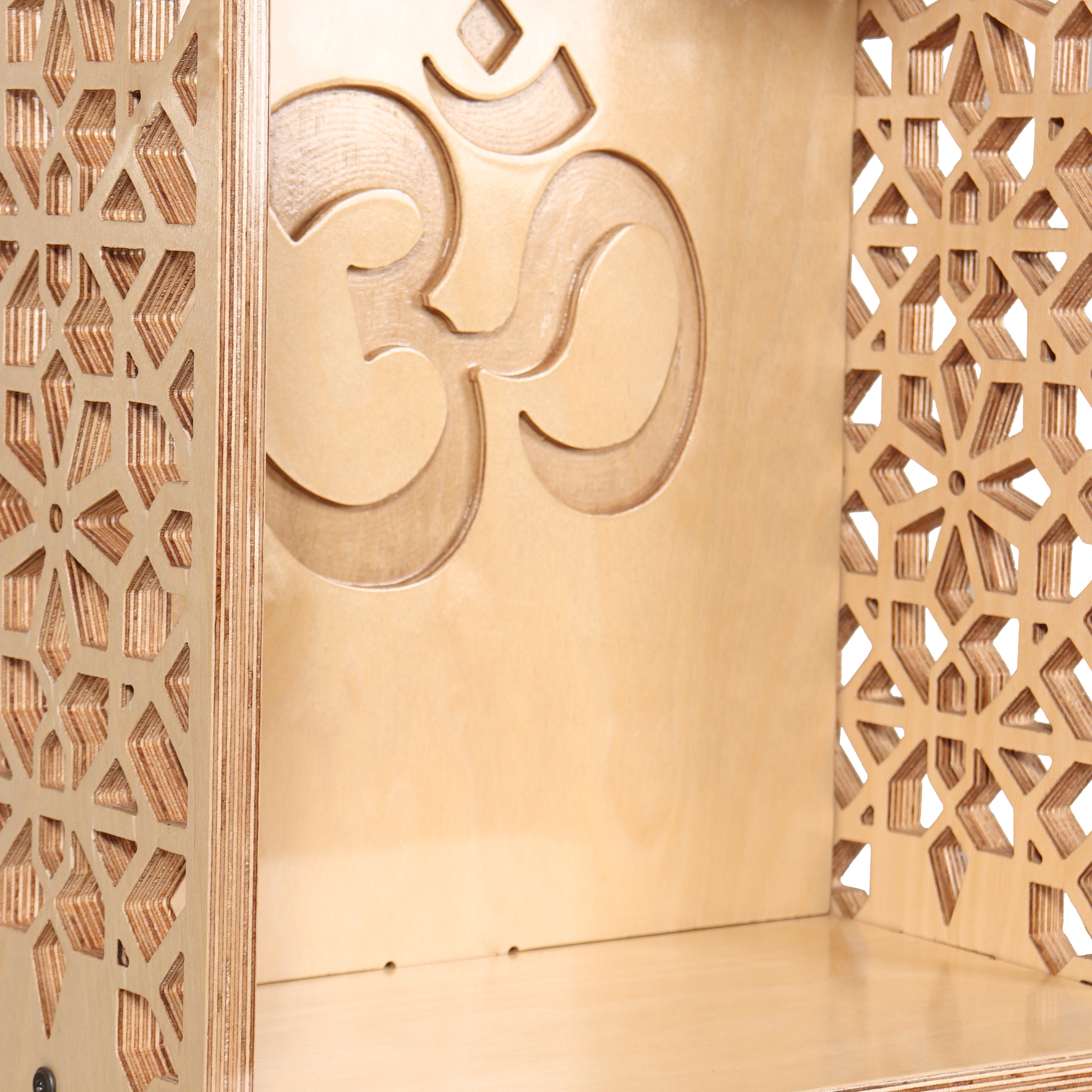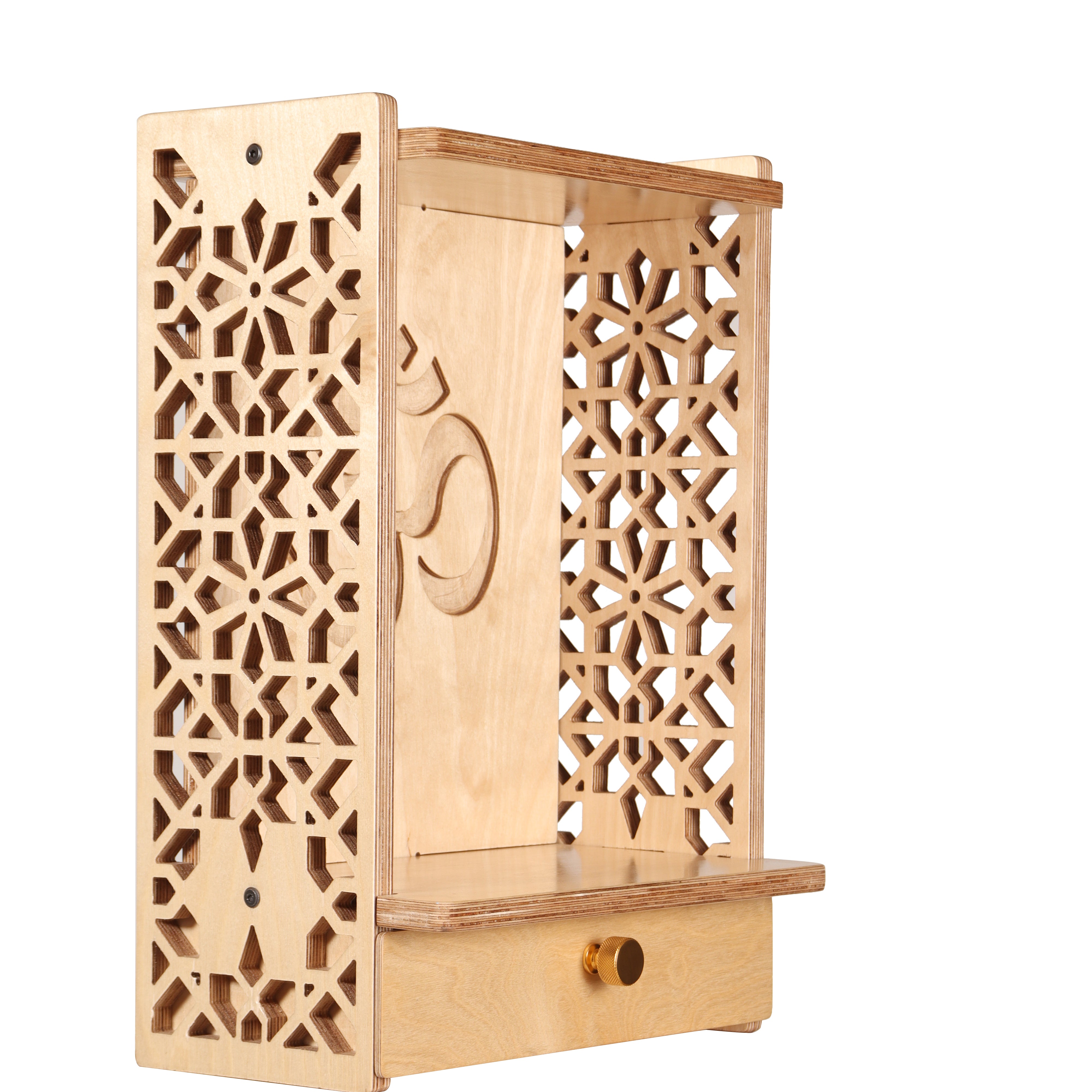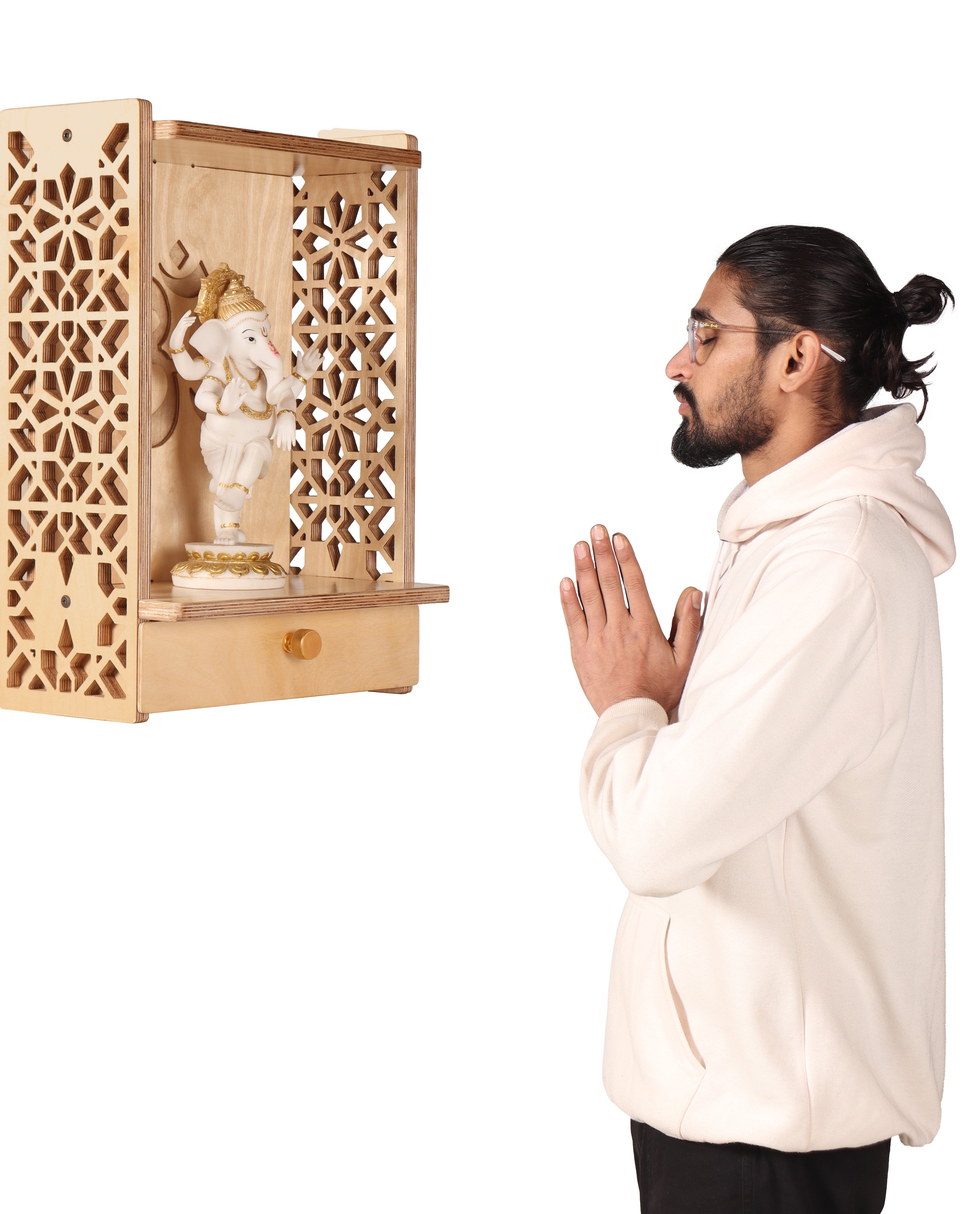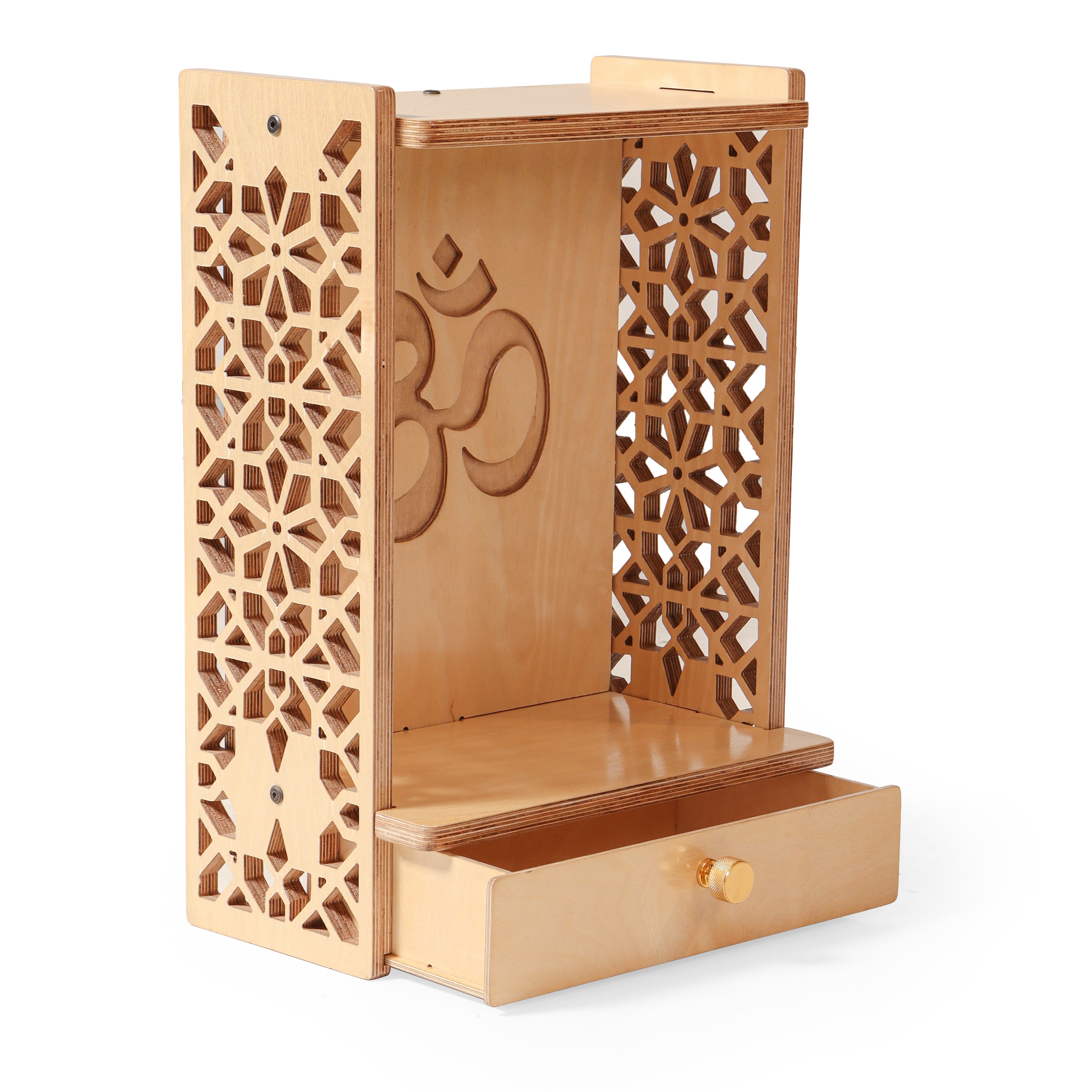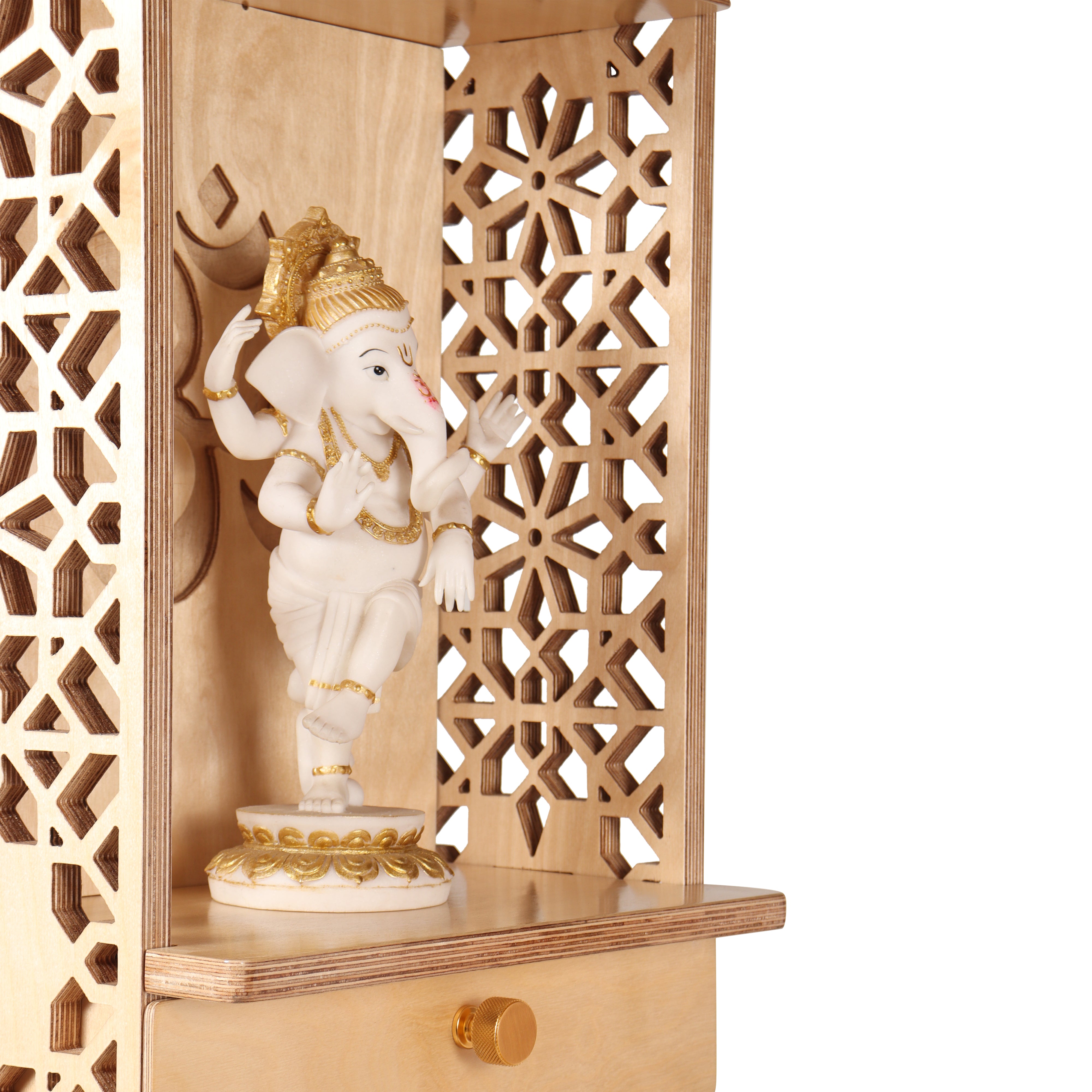 The Sarv wall hung Mandir is your portal to inner peace and spiritual alignment. This compact, wall-mounted design offers a minimalist aesthetic, ideal for creating a designated prayer space without sacrificing valuable floor area. The intricate Jaali patterns adorning the mandir's facade are a captivating representation of Indian artistic heritage and architecture, meticulously crafted with the utmost detail. A convenient slide-in drawer keeps your incense and other spiritual essentials neatly tucked away, ensuring a clutter-free prayer space. To personalize your sarv Mandir, Kaalzua offers the option of a customized back wall, allowing you to incorporate a special logo or message that reflects your devotion. This exquisite mandir is more than just a place to house your sacred items; it's a beautiful expression of your faith and a sanctuary for inner reflection.