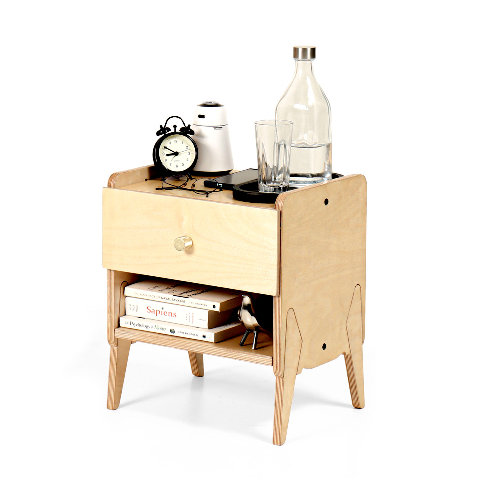 The bedside table is crafted from high quality CARB certified Birch wood and hand finished with natural oils. The flat pack format of the piece is ideal for modern living. And finally, the look of this piece lends you that minimalistic aesthetics. Overall, the piece exhibits an excellent combination of exclusive materials and practical design.