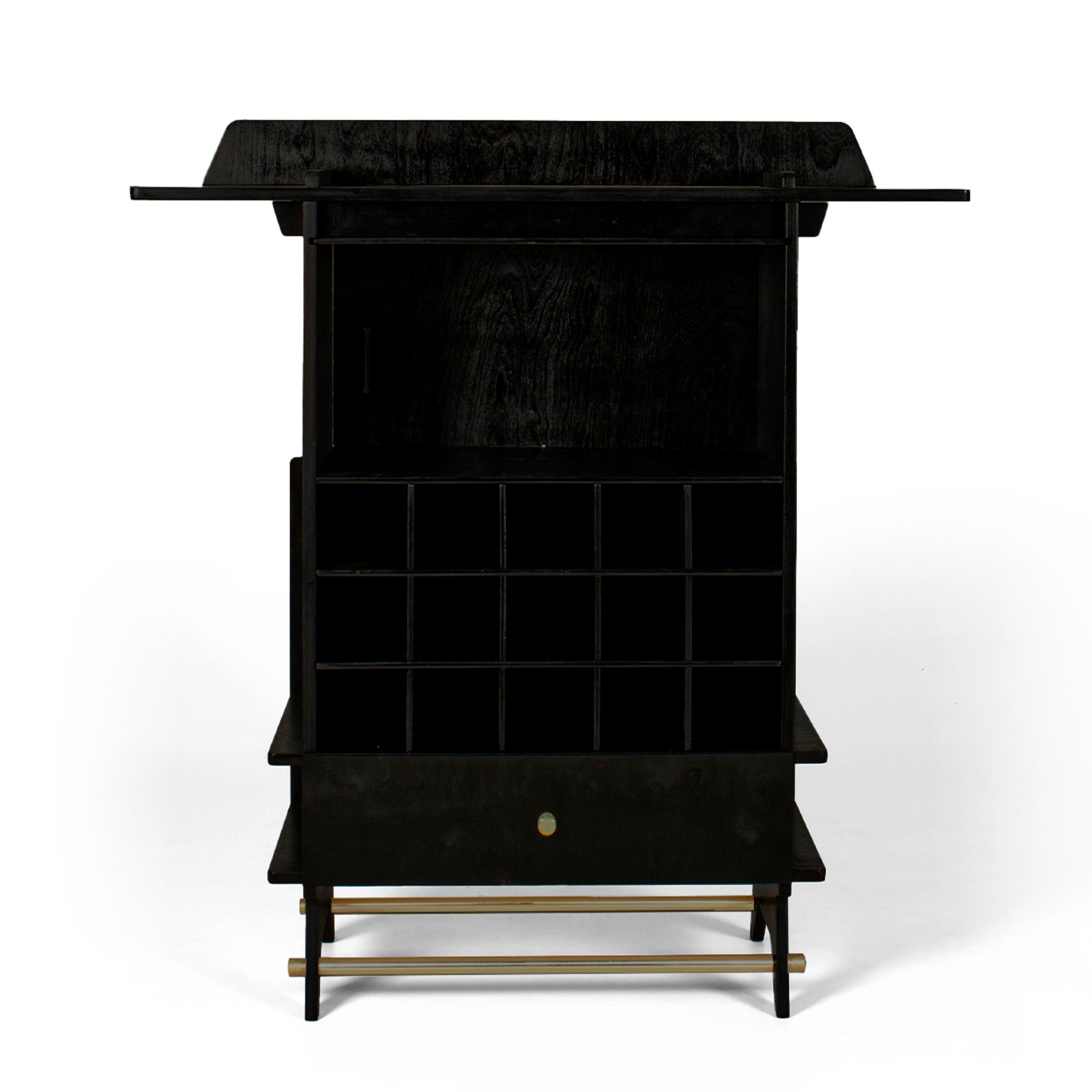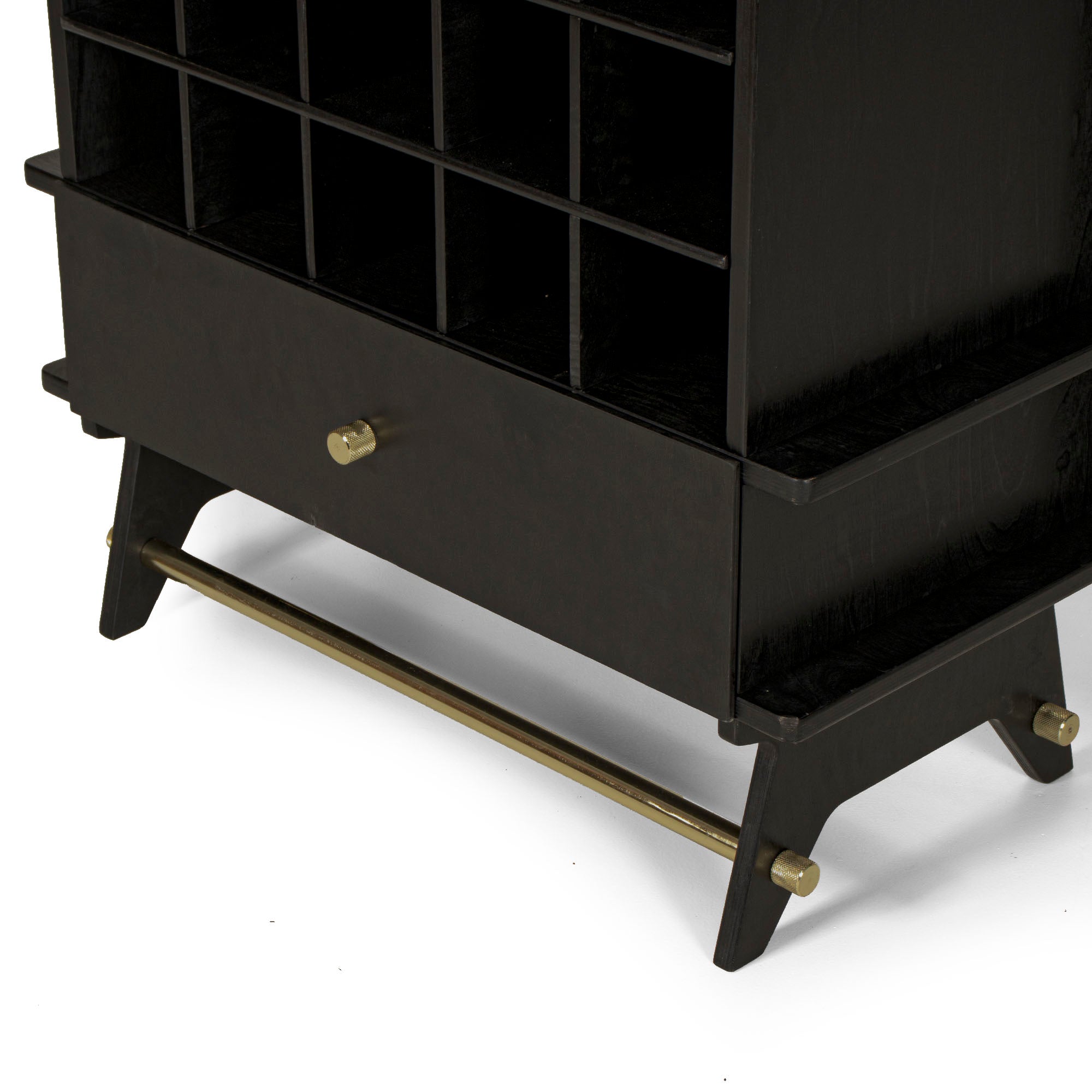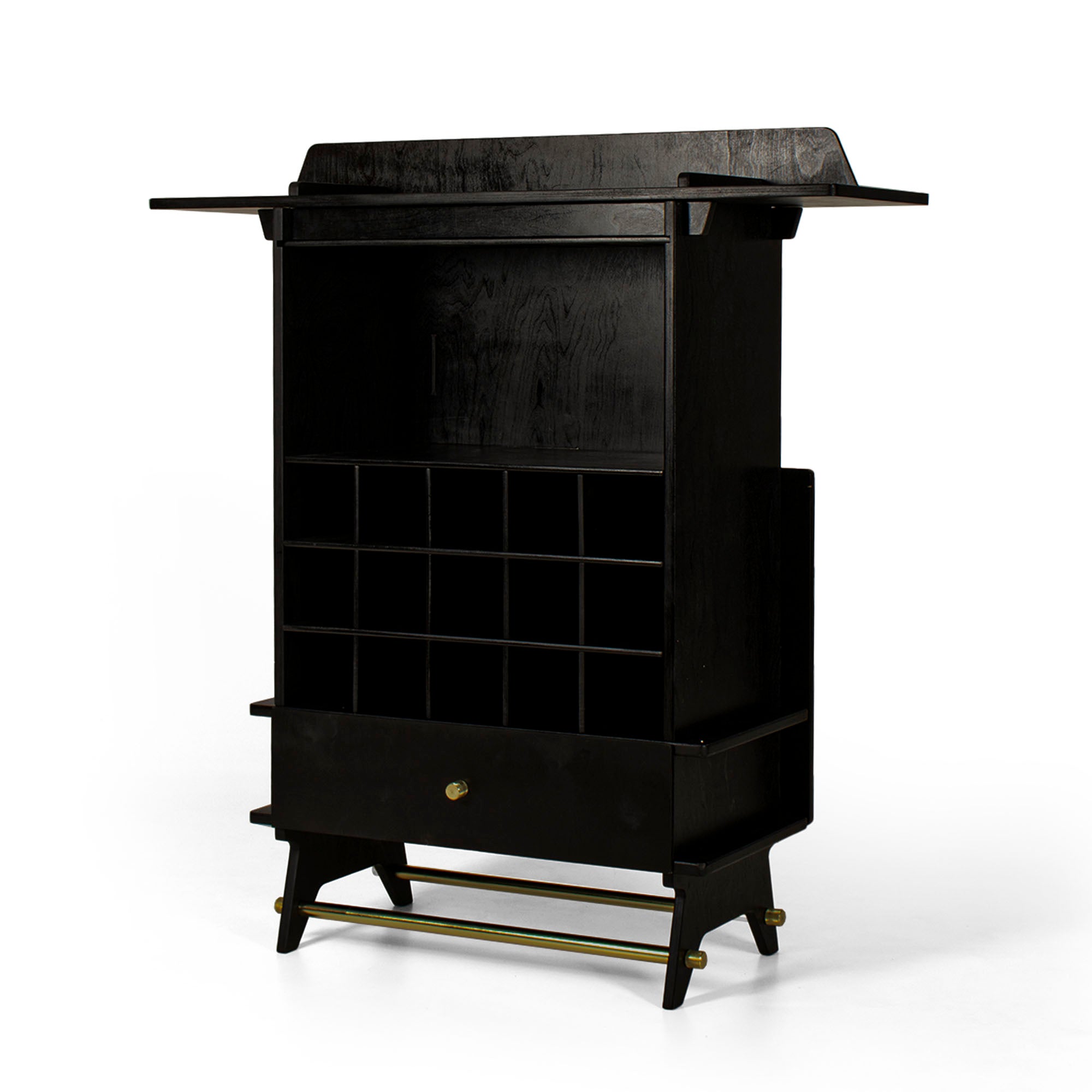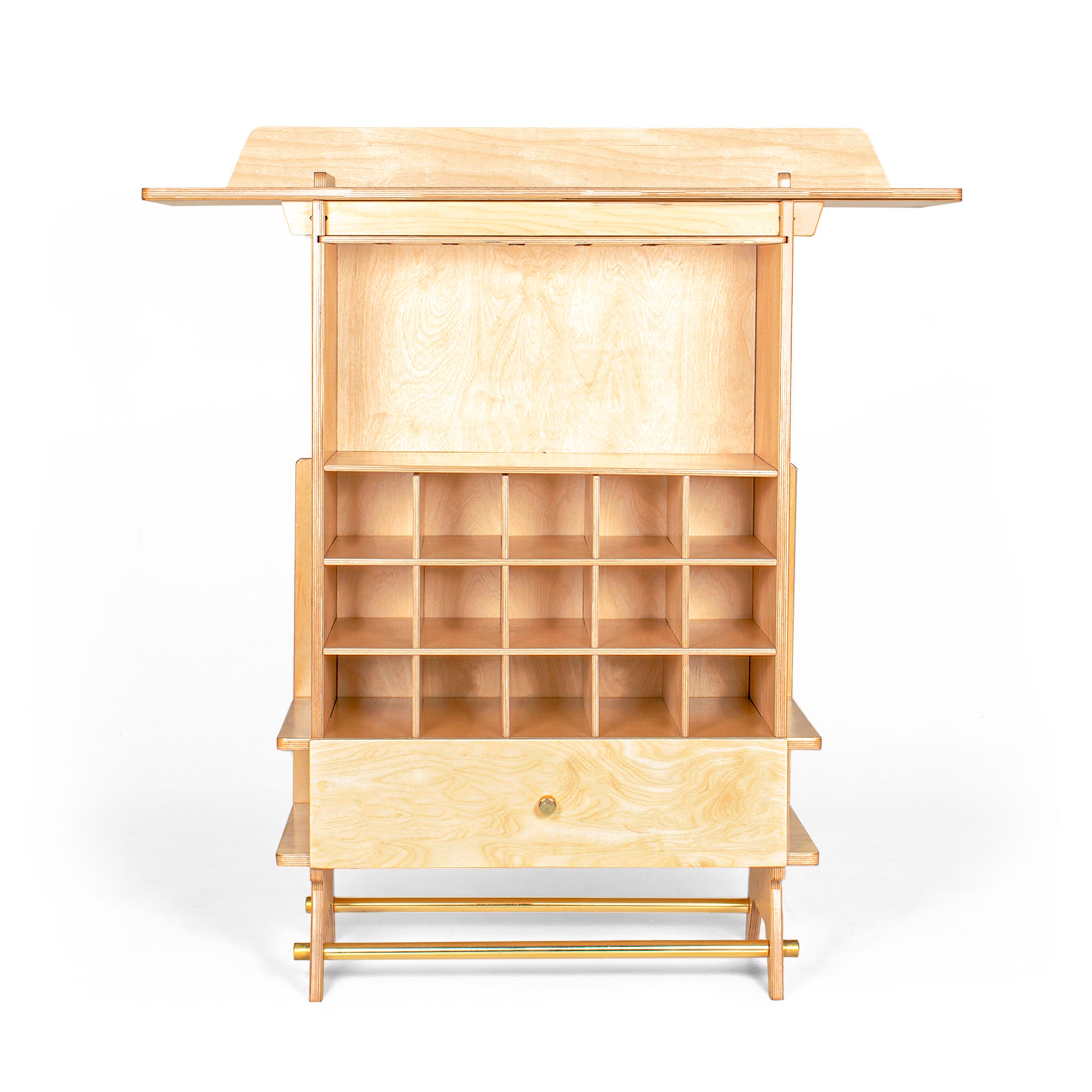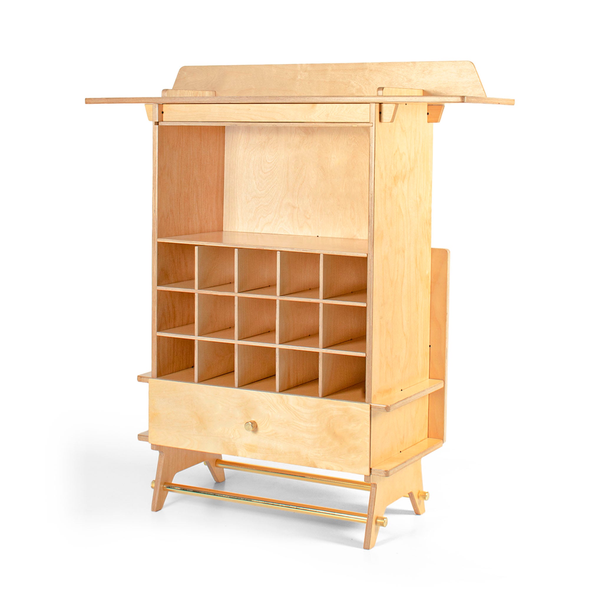 This elegant bar is designed from the best quality CARB certified birchwood. The piece comes in flat pack format. This means that now you can assemble or disassemble the piece in just minutes. This piece is the perfect embodiment of minimalistic aesthetics. At any given time, the cellar of this bar can hold up to 15 bottles. The bar comes with a detachable drawer that allows you to further store your drinking paraphernalia. Sleek clean top of this bar is not only ideal for preparing drinks but also serving them. The extended top of the bar can very conveniently seat two people as you roll out the drinks. Two brass rods add to the overall beauty of the piece along with giving it that necessary strength. The structure is derived from interlocking techniques and it is extremely mobile for it can be put together within minutes.
