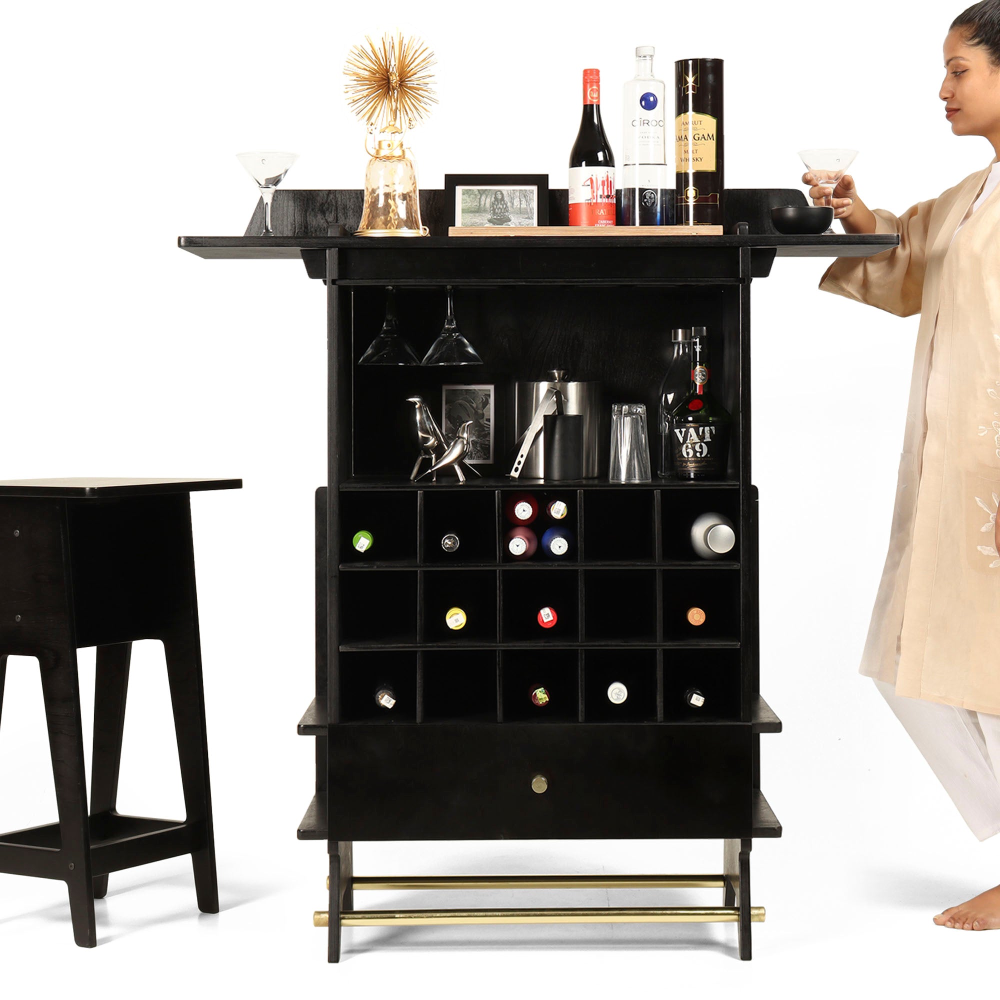 Yava is a bar where you can store, prepare and serve drinks; and very conveniently display your bartending skills. Compact in look this bar has a world of storage.it hits some fantastic notes on fun and functionality with slots and shelves for bottles. Moreover, it is guaranteed that its look will not go unnoticed.