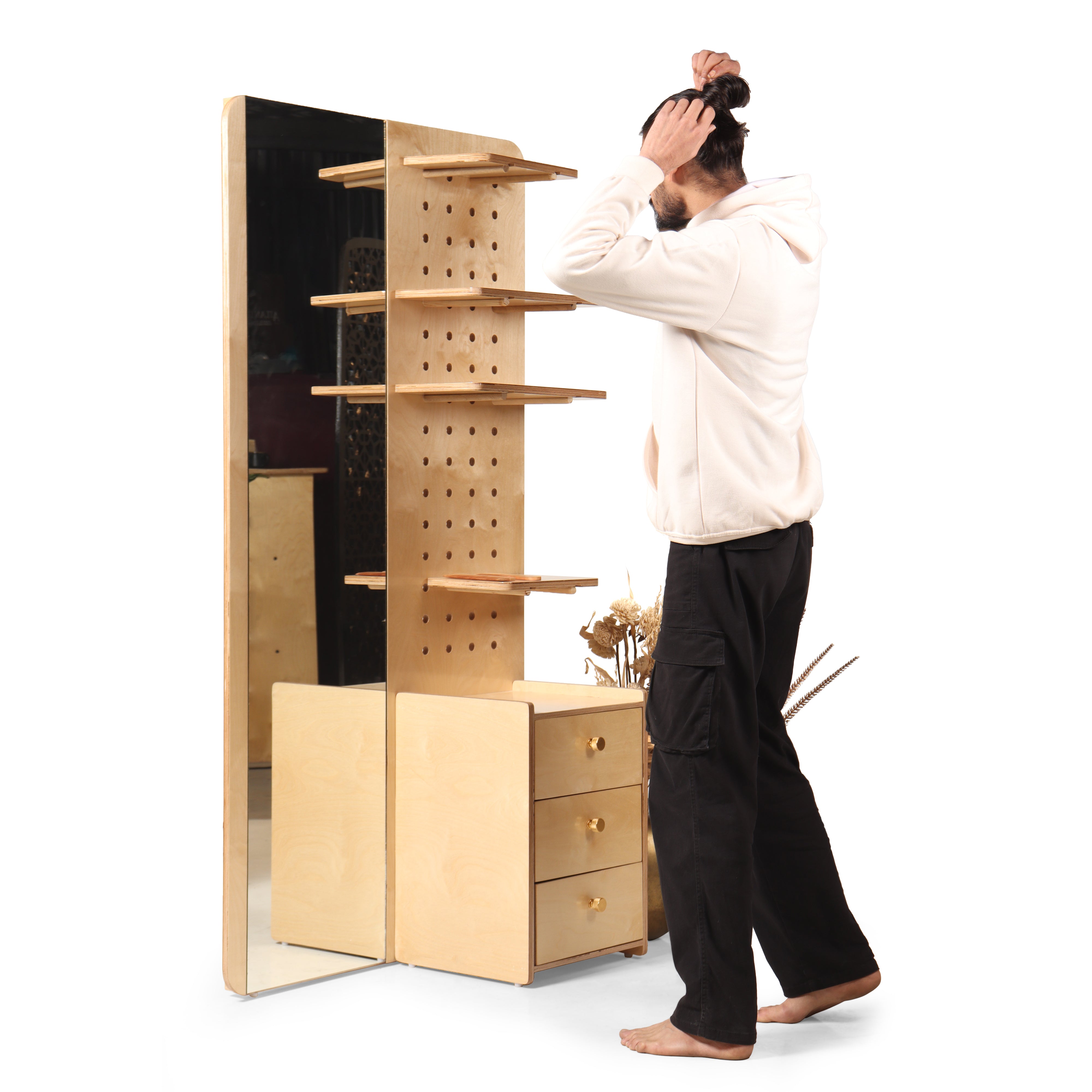 Introducing Zaru Dressing Cabinet - your customizable storage solution designed to cater to your unique needs. Featuring a versatile pegboard design, you can adjust the shelves to fit your belongings perfectly. The accompanying 6 ft tall mirror offers a flawless reflection, while three spacious drawers at the base provide ample storage for your essentials. Elevate your dressing experience with Zaru - where functionality meets style seamlessly.